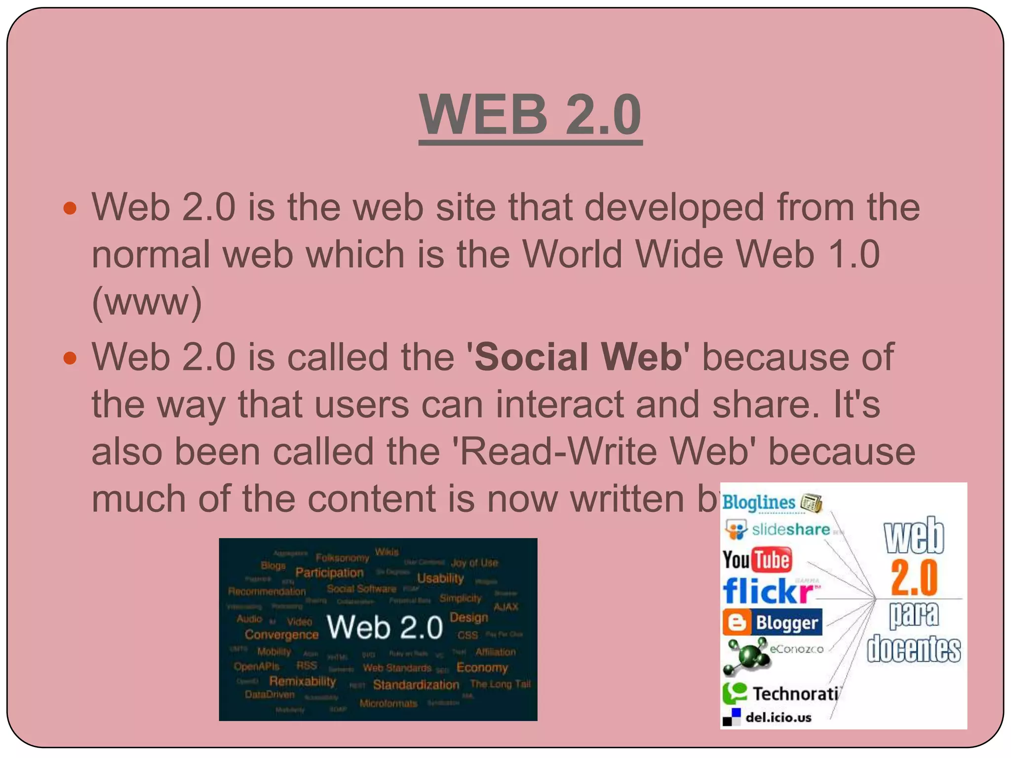 Web 2.0 allows users to interact with each other and share content online through features like blogs, wikis, social networks, and media uploading sites. Users can post links, photos, notes, and videos; comment and chat with others; collaboratively edit content; and create their own blogs, pages, and media. Popular examples of Web 2.0 include social media sites that let users connect, share information and media, and comment on each other's posts.