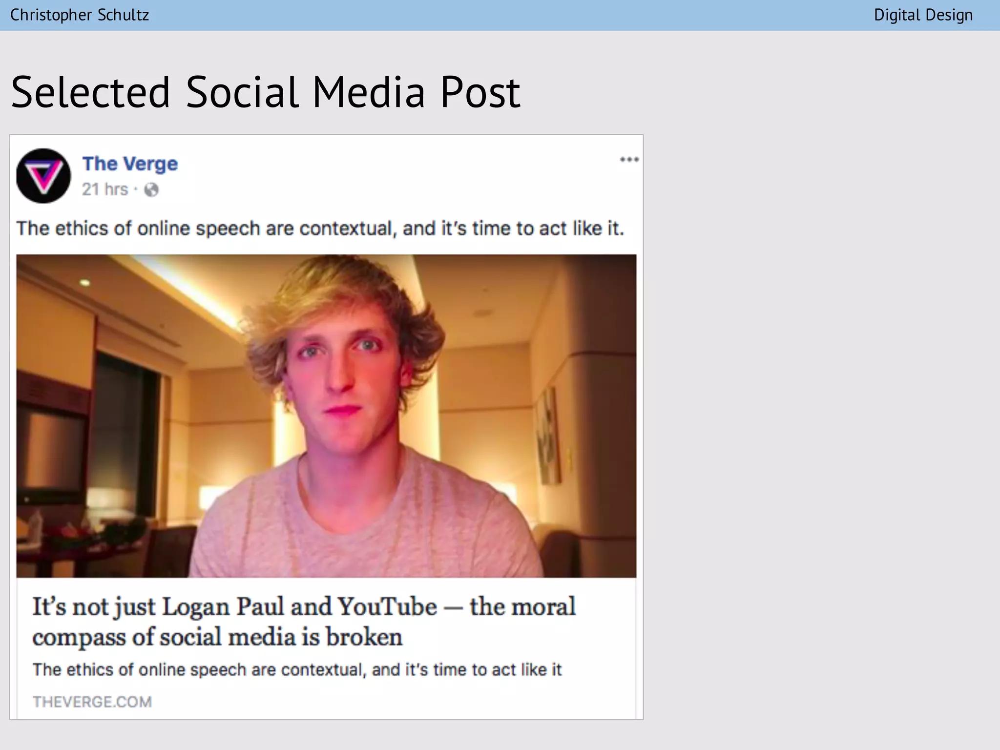 The social media post discusses research on the ethics and social responsibility of the internet. It shares three links to articles about how social media allows people to have their voices heard, how the open internet poses risks to public safety, and how adolescents are at risk of social issues and criminal behavior due to social media. It also includes a link to the author's Diigo page where additional resources on the topic can be found.