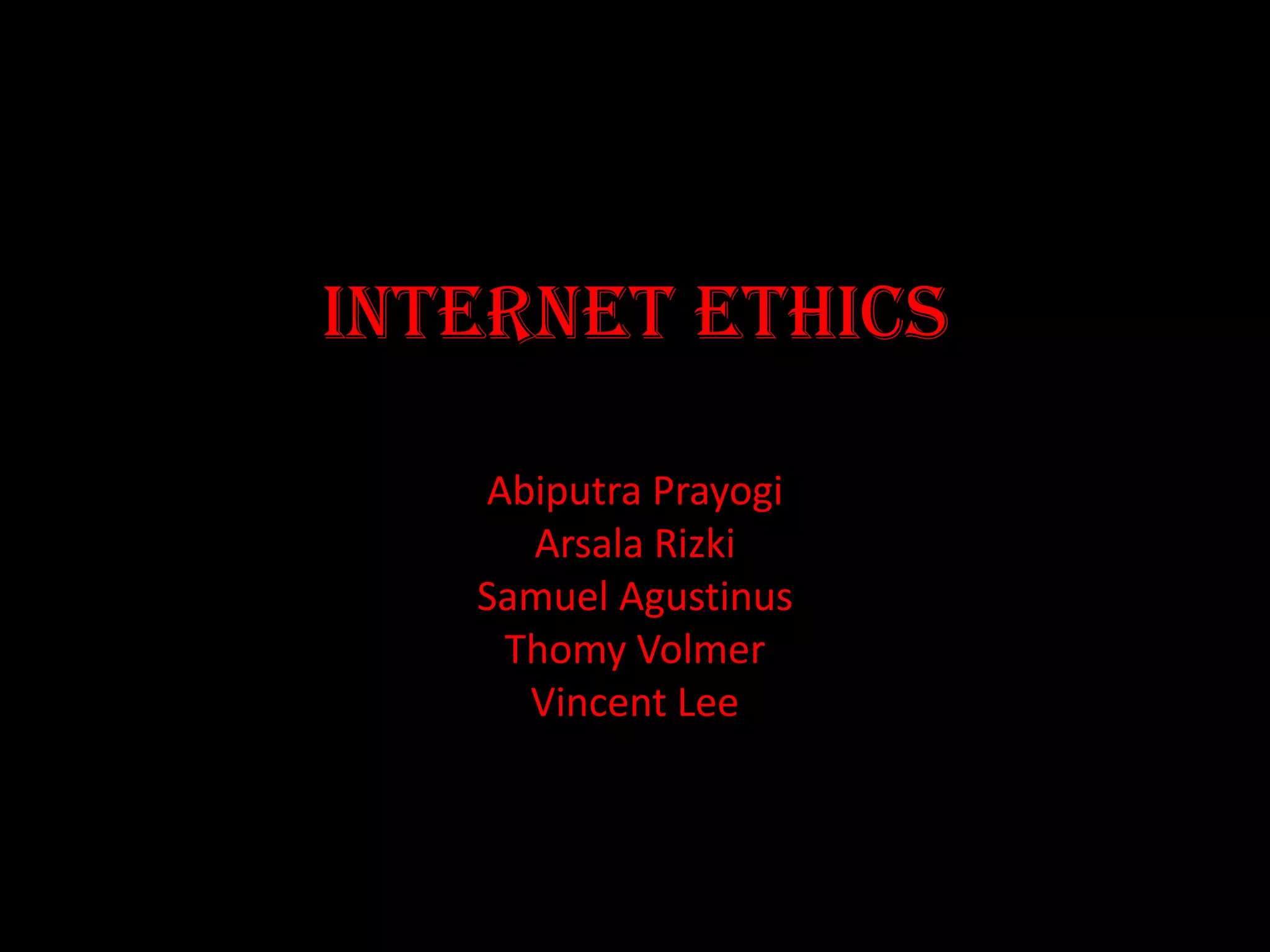 The document discusses negative impacts of the internet and how governments should restrict it. It argues that the internet makes people addicted and damages health, is unsecured for children, and allows uncontrolled spread of private data and viruses. It agrees governments should restrict the internet to protect privacy, security, and children from violent or vulgar content. Suggested restrictions include ID-controlled adult site access, parental controls, provider restrictions of unsecured sites with harmful content, and information filtering.