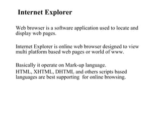 Internet Explorer is a web browser used to view web pages. It has a title bar, menu bar, standard toolbar, address bar, links bar, status bar, and main window. The standard toolbar contains buttons for common functions like back, forward, and home. The address bar shows the URL of the current page. The links bar displays favorite or frequently visited pages. Other browsers include Firefox, Chrome, Safari, Opera, and Camino, each with their own unique features and supported platforms.