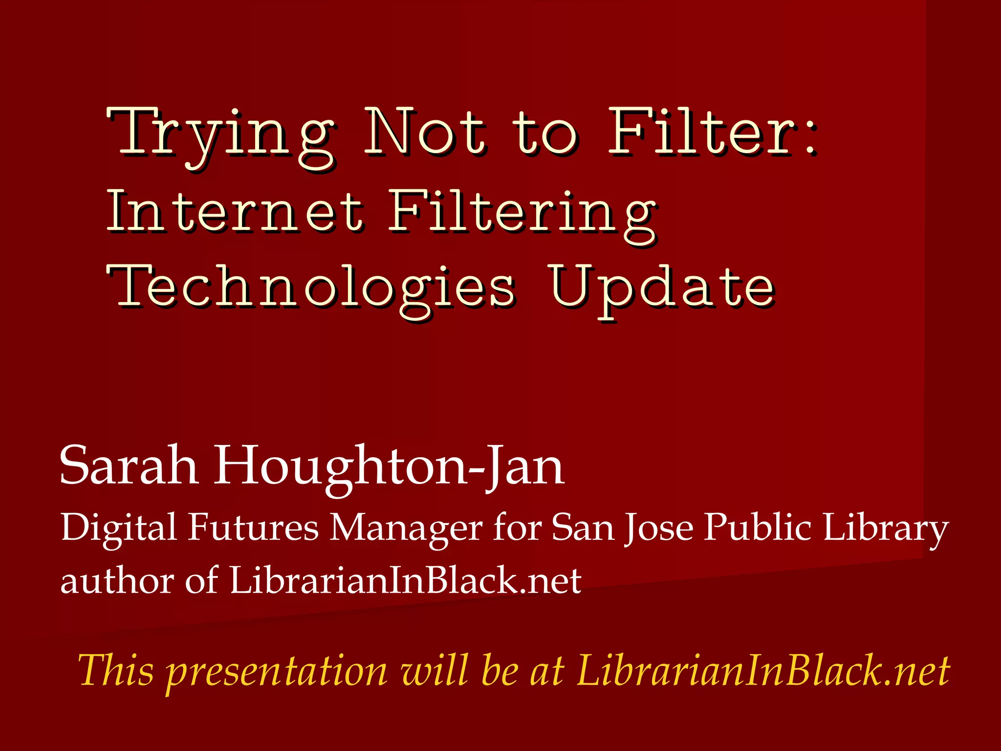 This document discusses challenges related to implementing internet filtering technologies in public libraries, particularly focusing on legal definitions of obscenity and child pornography. It presents findings from filter testing to illustrate inaccuracies and issues of overblocking and underblocking of content. The author advocates for community involvement and thorough assessment before adopting filtering policies, emphasizing that no filter can effectively distinguish harmful content without also blocking valuable resources.