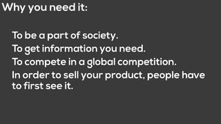 Internet for Life Why you need it: To be a part of society. To get information you need. To compete in a global competition. In order to sell your product, people have to first see it. Why you didn’t Start: You don’t know where to start. You’re not sure if your efforts are having an impact. It’s not growing organically and it’s not rational. In order to sell your product, people have to see it first. How to Market yourself? The Product is You Value proposition Hedgehog Concept Advanced Search: Exact word or phrase. File type. Terms appearing. Targeting What is Social Media: Communication. Information. Marketing. Selling. It’s Everything. Competition What is Linkedin: It’s not a facebook. It’s not a job Search site. It’s an Economic Graph. The Hero What is Google Apps: Gmail. Drive. Calendar. Kareem Samara Founder & Community Manager FB.com/SBKits Me@KareemSamara.com