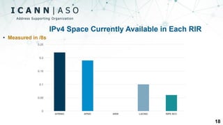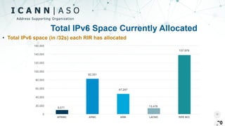 Regional Internet Registries (RIRs) manage internet number resource allocations and registrations in specific global areas. Each RIR received its last /8 IPv4 address block from IANA on February 3, 2011, and there is a notable increase in IPv6 adoption, with 61% of members holding IPv6 resources and total IPv6 capability reaching 22%. The document provides detailed statistics on various RIRs, including their ASN and IPv4/IPv6 allocations.