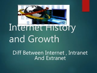 The document discusses the history and growth of the internet. It defines the internet as a network of networks that connects government, university, and private computers globally to share email, files, and other resources. Key events included the creation of ARPANET in 1969, development of TCP in 1974, and adoption of TCP/IP in 1984. The internet grew from 1000 hosts in 1984 to become the largest network in the world. Intranets are internal corporate networks using internet standards, while extranets connect a company's intranet to partners via VPN tunnels over the public internet.