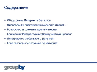 Документ предоставляет обзор рынка интернета в Беларуси, включая данные о пользователях, их демографические характеристики и использование интернета. Рассматриваются возможности интерактивных коммуникаций бренда и методы их интеграции с глобальными медиа стратегиями для эффективного маркетинга в интернете. Также документ обсуждает значимость уникальных свойств интернета как нового типа медиа для продвижения товаров и услуг.