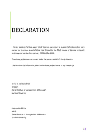 The document is a student project report on internet marketing. It includes an introduction discussing the evolution of marketing and advertising. It then discusses internet marketing and advertising. Key points covered include the advent of the internet and how it has challenged traditional advertising, the 7 P's of internet marketing, benefits of internet marketing, types of internet advertising and trends. It also describes research conducted including objectives, methodology, findings and case studies on various companies' internet marketing strategies.