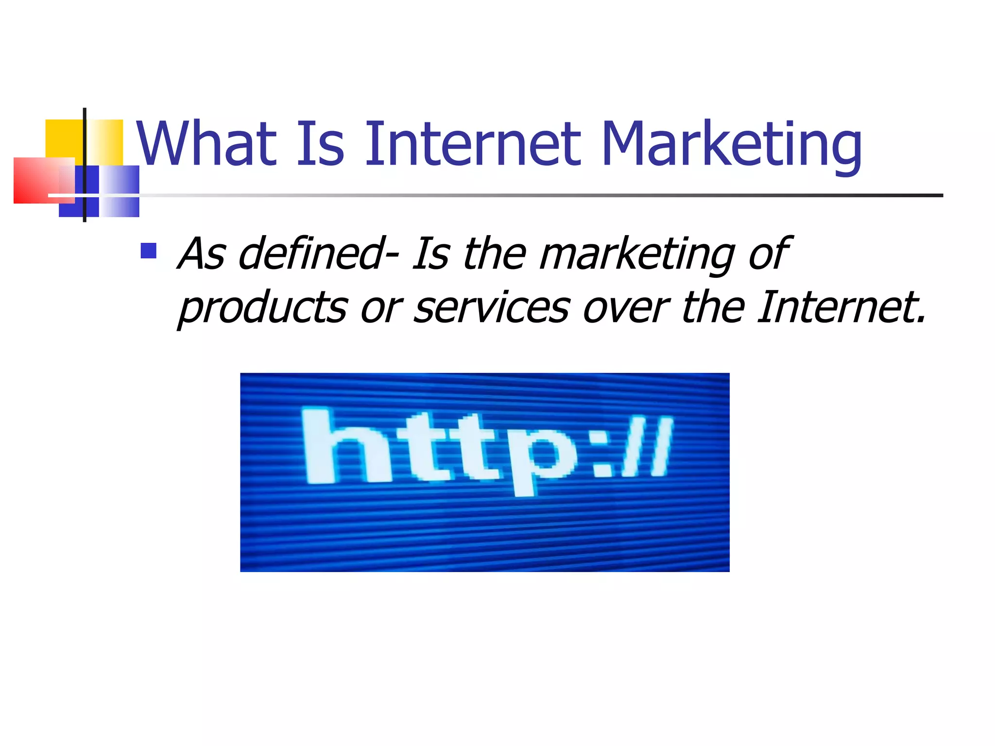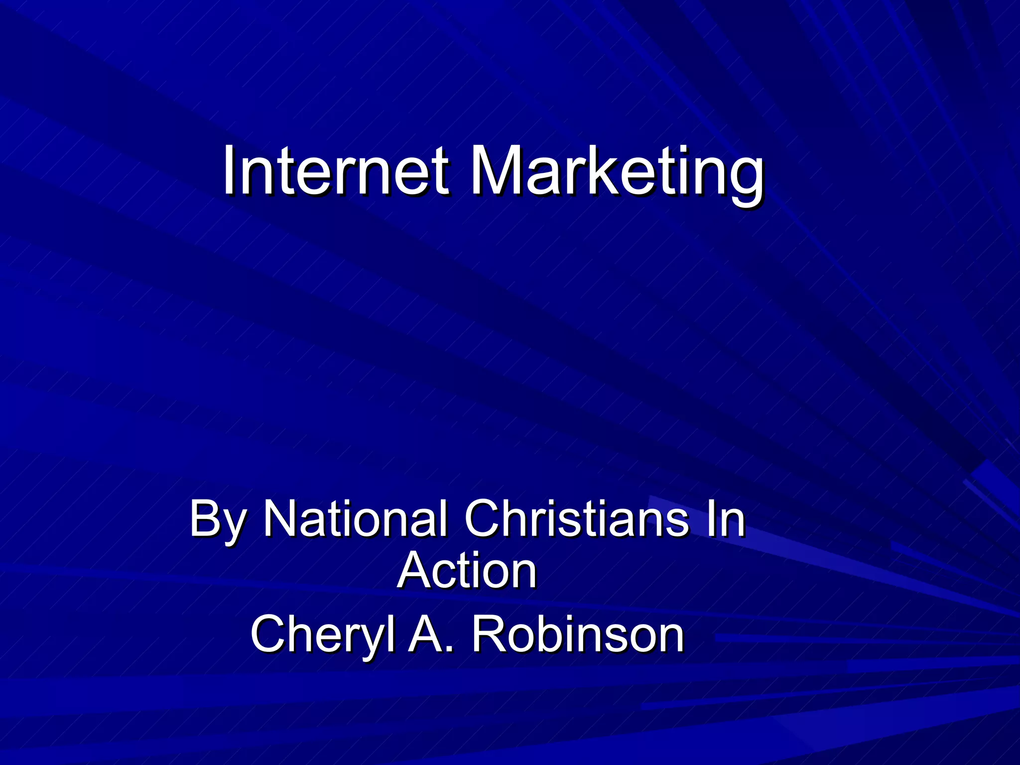 This document discusses internet marketing and provides an overview of various internet marketing strategies and tools. It defines internet marketing as marketing products or services over the internet. It highlights statistics on internet usage globally. It also describes different internet marketing business models like e-commerce, affiliate marketing, and local internet marketing. Additionally, it outlines various internet sources for marketing like websites, social networks, blogs, webinars, videos and their uses. It then discusses National Christians In Action's training program and online classes for learning effective internet marketing strategies.