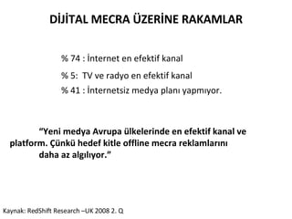 DİJİTAL MECRA ÜZERİNERAKAMLAR % 74 : İnternet en efektif kanal % 5: TV ve radyo en efektif kanal % 41 : İnternetsiz medya planı yapmıyor. “ Yeni medya Avrupa ülkelerinde en efektif kanal ve platform. Çünkü hedef kitle offline mecra reklamlarını daha az algılıyor.” Kaynak: RedShift Research –UK 2008 2. Q