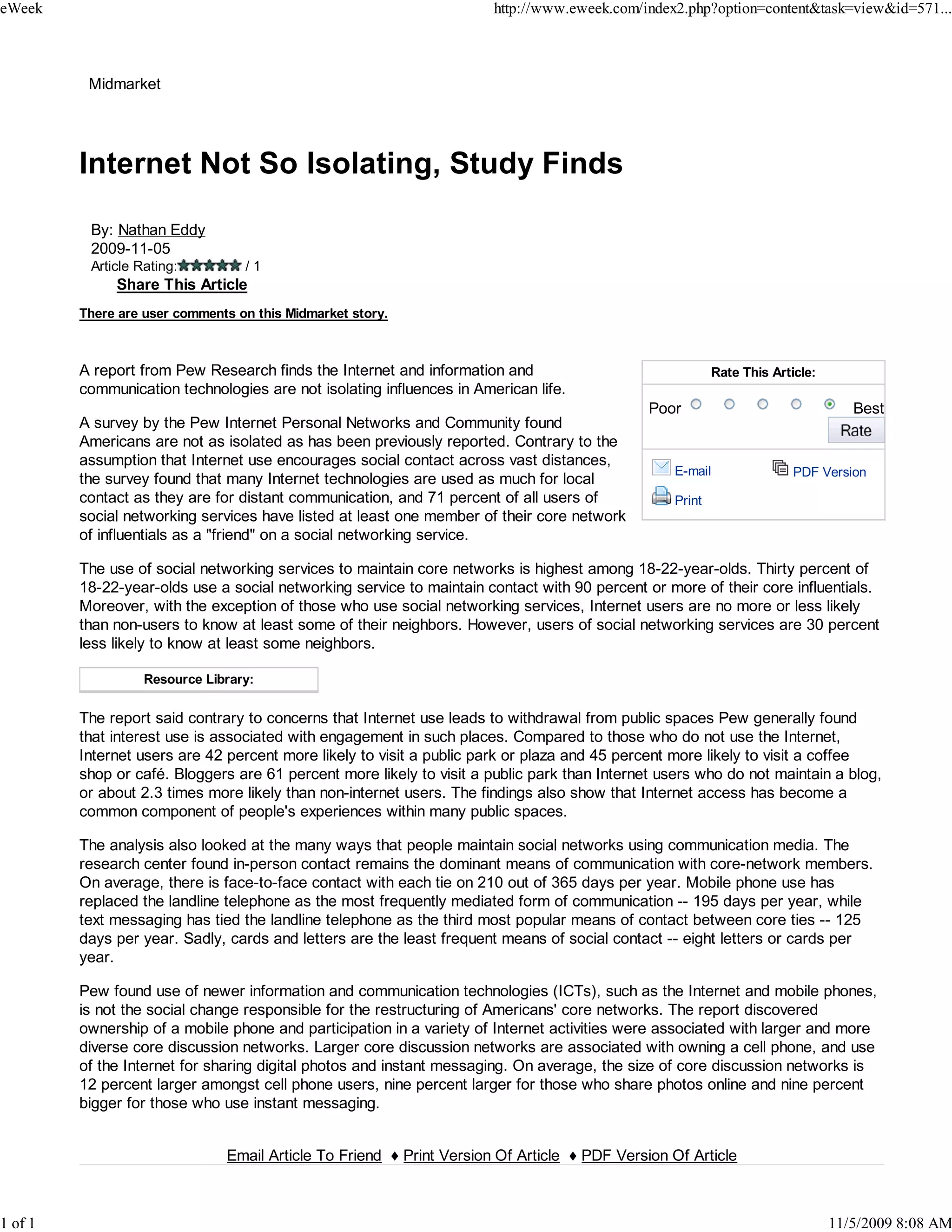 The document summarizes a report from the Pew Research Center that found that the internet and communication technologies are not isolating influences in American life, as has been previously thought. The survey found that 71% of social networking users list at least one member of their core network as a friend online. It also found that internet users are more engaged in public spaces than non-users. While in-person contact remains the primary means of communication, mobile phones have replaced landlines as the most frequent mediated communication. The report concludes that new technologies are associated with larger and more diverse social networks rather than social isolation.