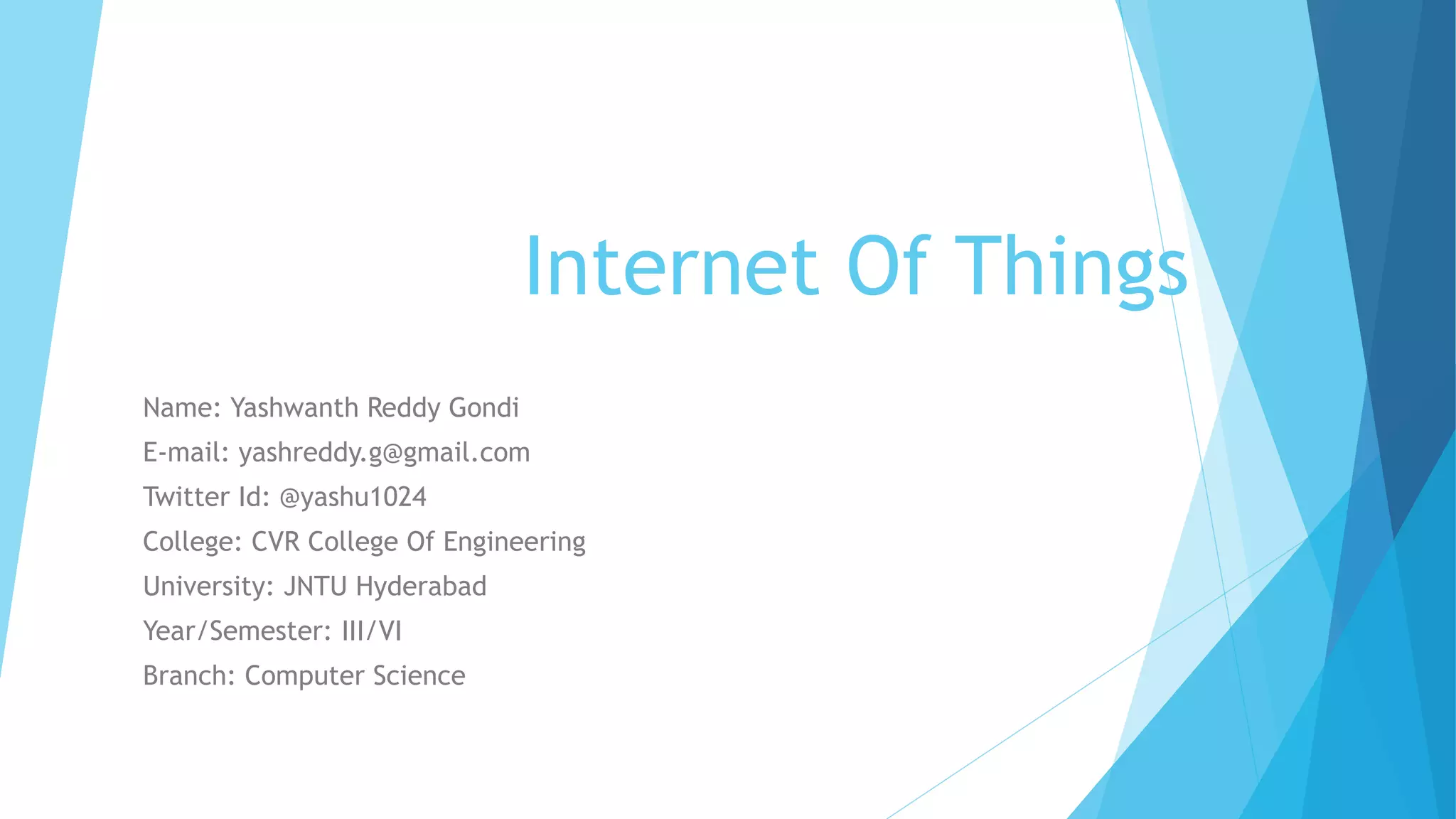 The document discusses the Internet of Things (IoT), which refers to a network of interconnected physical objects capable of collecting and analyzing data to enhance user experiences. It highlights the potential benefits of IoT, such as personalized services and improved control over devices while also noting the challenges of data management and compatibility among devices from different manufacturers. The author expresses a desire to work on creating a unified architecture for IoT that promotes interoperability and consumer-centric solutions.