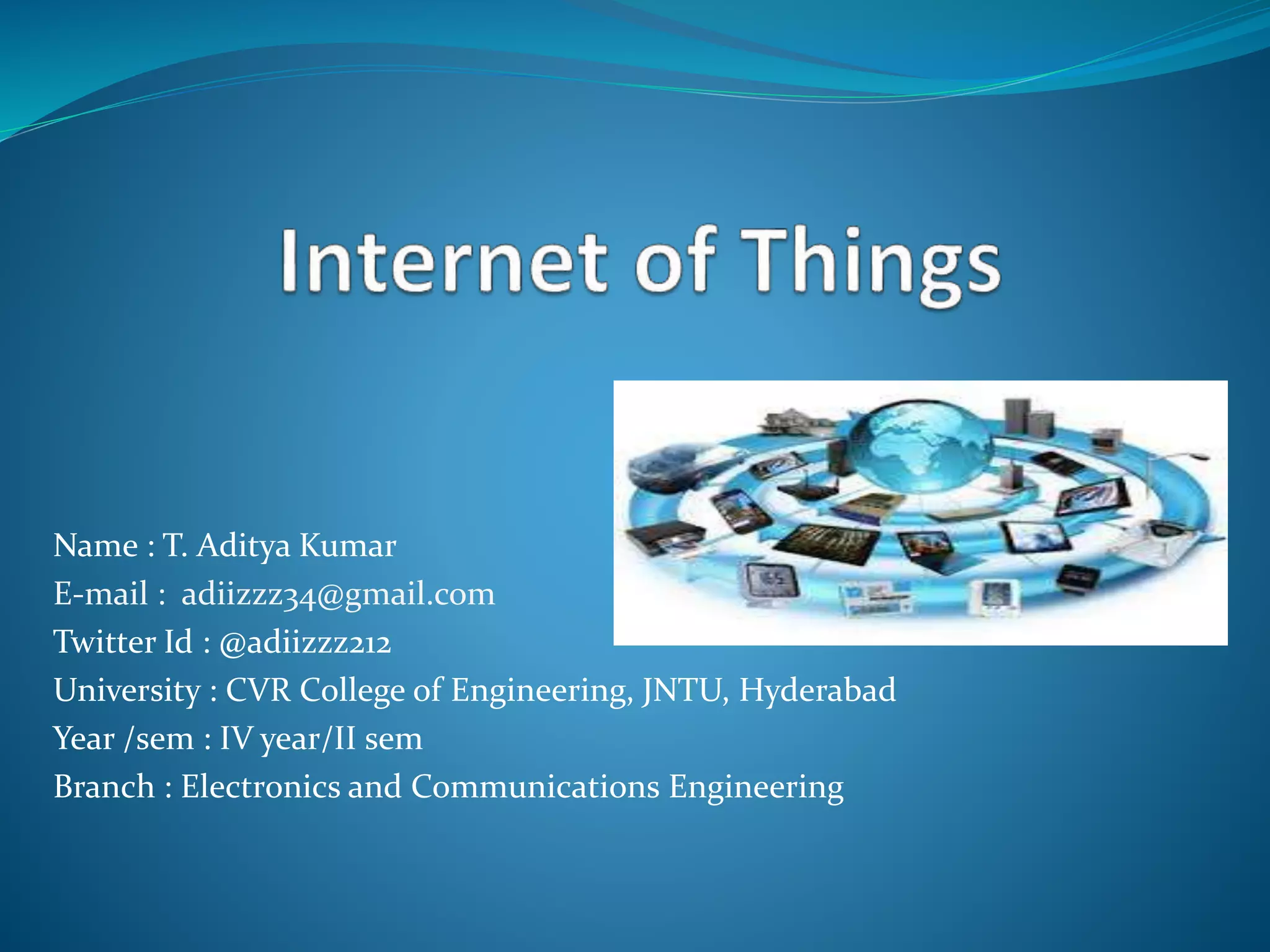 The document introduces T. Aditya Kumar, a fourth-year electronics and communications engineering student at CVR College of Engineering, discussing the Internet of Things (IoT) and its significance in connecting everyday objects to the internet. Key trends include energy management, healthcare applications, and intelligent transportation, highlighting how IoT can revolutionize healthcare by reducing device downtime, proactive supply fulfillment, and efficient scheduling. Aditya expresses a desire to work in the healthcare sector.