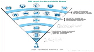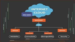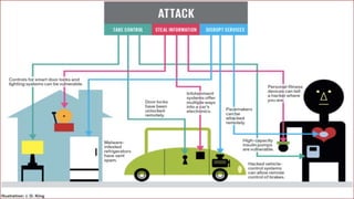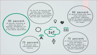 The document discusses security challenges with Internet of Things (IoT) devices and solutions to improve IoT security. It outlines that IoT systems connect various devices to networks, but many current devices have weaknesses like default passwords, vulnerabilities in protocols, and lack of updates. This can enable attacks like denial of service, data theft, and device compromise. The document recommends manufacturers implement security features like access control, authentication, encryption and that users isolate devices, change passwords, and keep software updated to safeguard IoT systems and the data they generate.