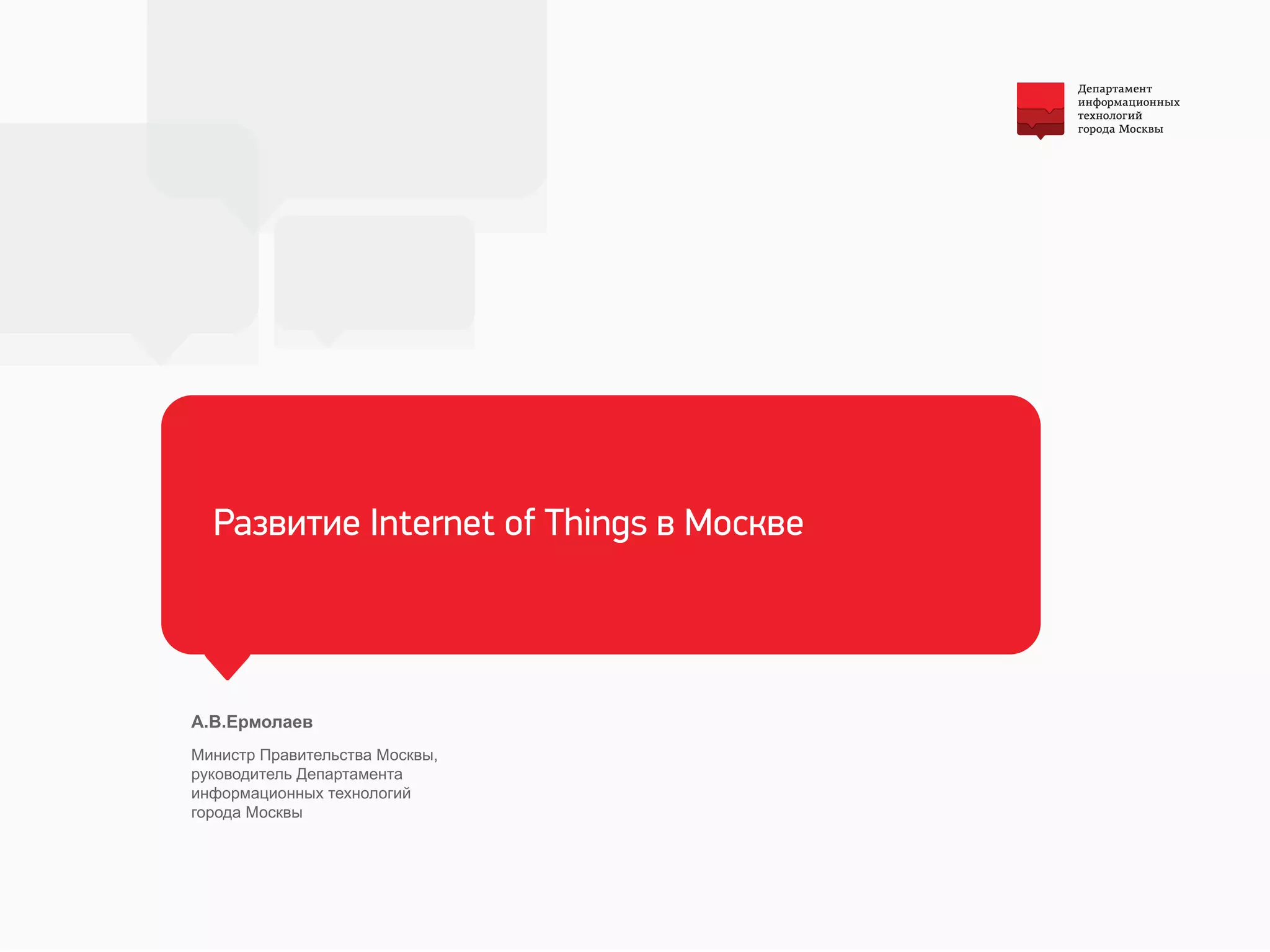 Доклад министра правительства Москвы А. В. Ермолаева освещает развитие Internet of Things (IoT) в столице, подчеркивая его значимость для автоматизации, повышения эффективности госуправления и улучшения качества жизни горожан. Среди ключевых инициатив — умные парковки, системы учета ресурсов и мониторинга в ЖКХ, а также использование носимых устройств в здравоохранении. В перспективе планируется переход от IoT к Internet of Everything (IoE) для более эффективного использования данных и создания надежной инфраструктуры.