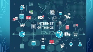 The document discusses the Internet of Things (IoT). It defines IoT as physical objects embedded with electronics, software and sensors that can connect and exchange data over the internet. It explains that IoT works through technologies like communication, sensing, processing and localization. Finally, it lists some applications of IoT like traffic monitoring, health, security, transport and smart automobiles.