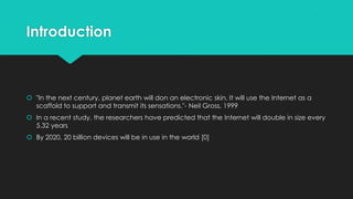 The document discusses the Internet of Things (IoT) as a critical emerging technology expected to connect approximately 20 billion devices by 2020, focusing particularly on home automation and security. It highlights the potential applications of IoT in various sectors and the challenges related to connectivity, security, and privacy that must be addressed. The conclusion emphasizes the need for expanding design considerations beyond just hardware and software to ensure user experience and safety.