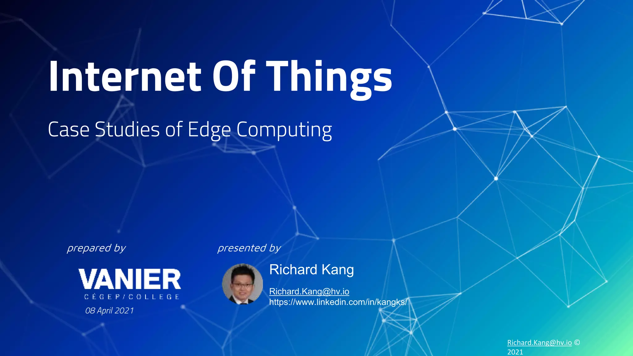 The document provides an overview of edge computing case studies presented by Richard Kang. It discusses Richard's professional experience and the architecture of IoT applications. It then examines the role of edge computing and several edge computing case studies in industries like automobiles, agriculture, manufacturing, smart homes and smart cities. It also compares different wireless communication technologies and low-power wide area network standards. In the end, it provides Richard's contact details and links to additional resources.