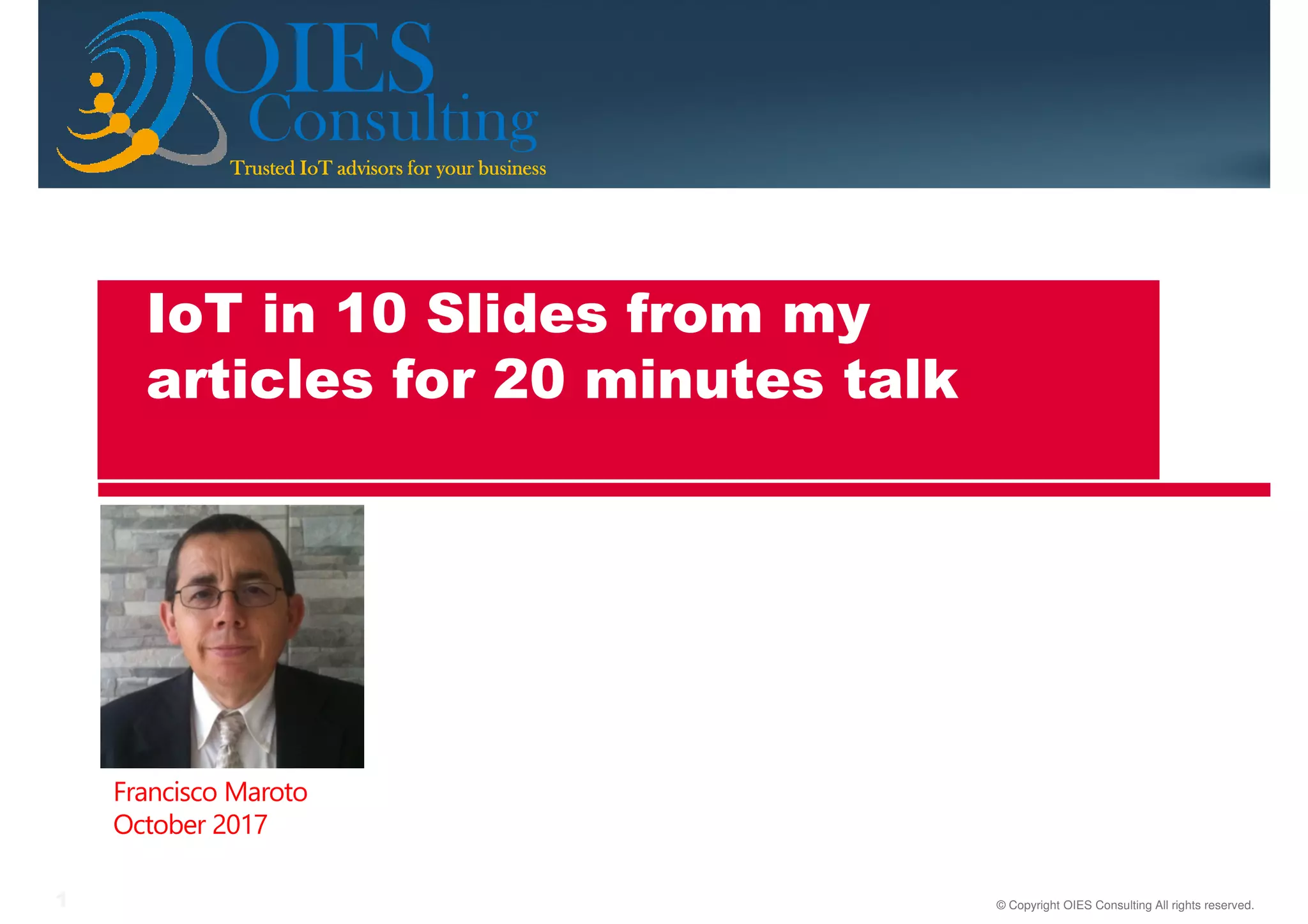 This 10 slide presentation discusses key topics related to internet of things (IoT) including IoT hype and predictions, lack of standards, security concerns, IoT platforms, architecture, industrial IoT, CEO interest, how to sell IoT, the impact on jobs, and whether IoT can help save the world. The presentation was created by Francisco Maroto of OIES Consulting for a 20 minute talk based on his articles.