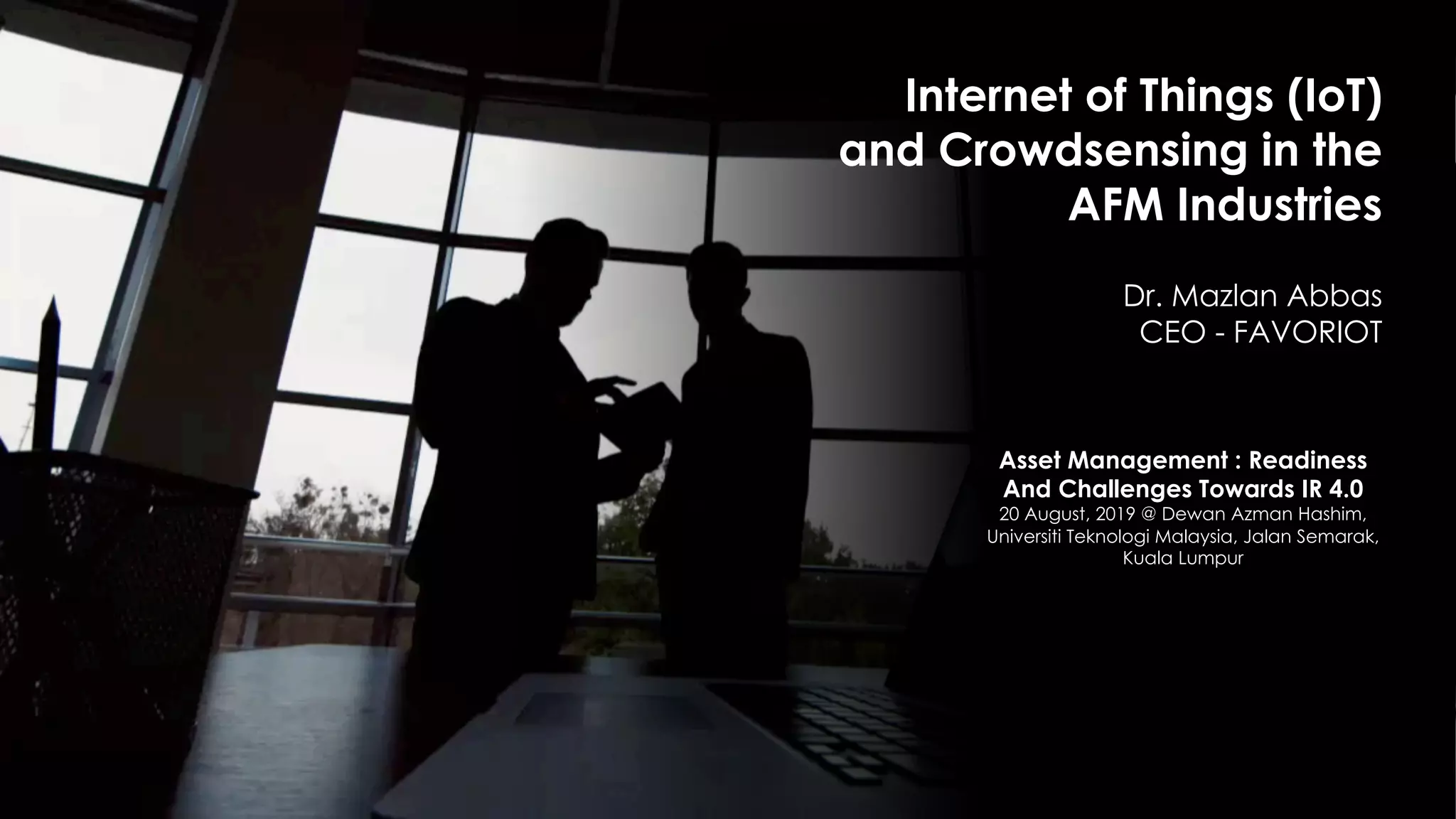 The document discusses Favoriot's role in the Internet of Things (IoT) and crowdsensing within various industrial contexts, particularly emphasizing the need for organizations to adapt to Industry 4.0. It outlines the challenges faced in implementing IoT, such as coordination and talent shortages, while proposing solutions for effective asset management and citizen engagement through crowdsensing platforms. Overall, it highlights the importance of data-driven decision-making to enhance community and city management.