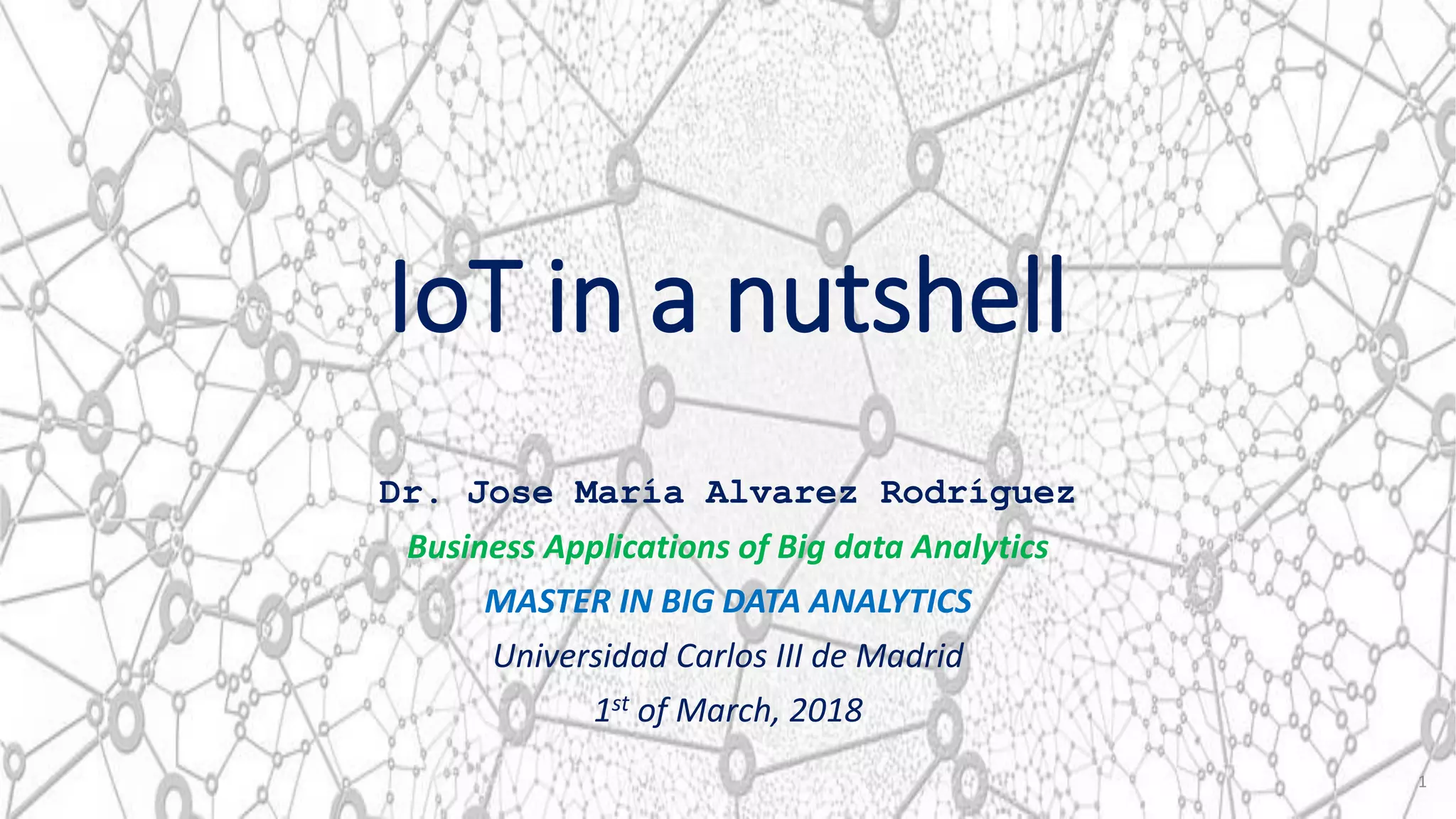 The document provides a comprehensive overview of the Internet of Things (IoT), highlighting its definition, characteristics, and various applications across smart cities, environments, water management, security, retail, and agriculture. It emphasizes the importance of big data analytics in the IoT ecosystem and outlines challenges such as interoperability and privacy. Additionally, it discusses the significance of designing smart services and evaluating their feasibility within different domains.