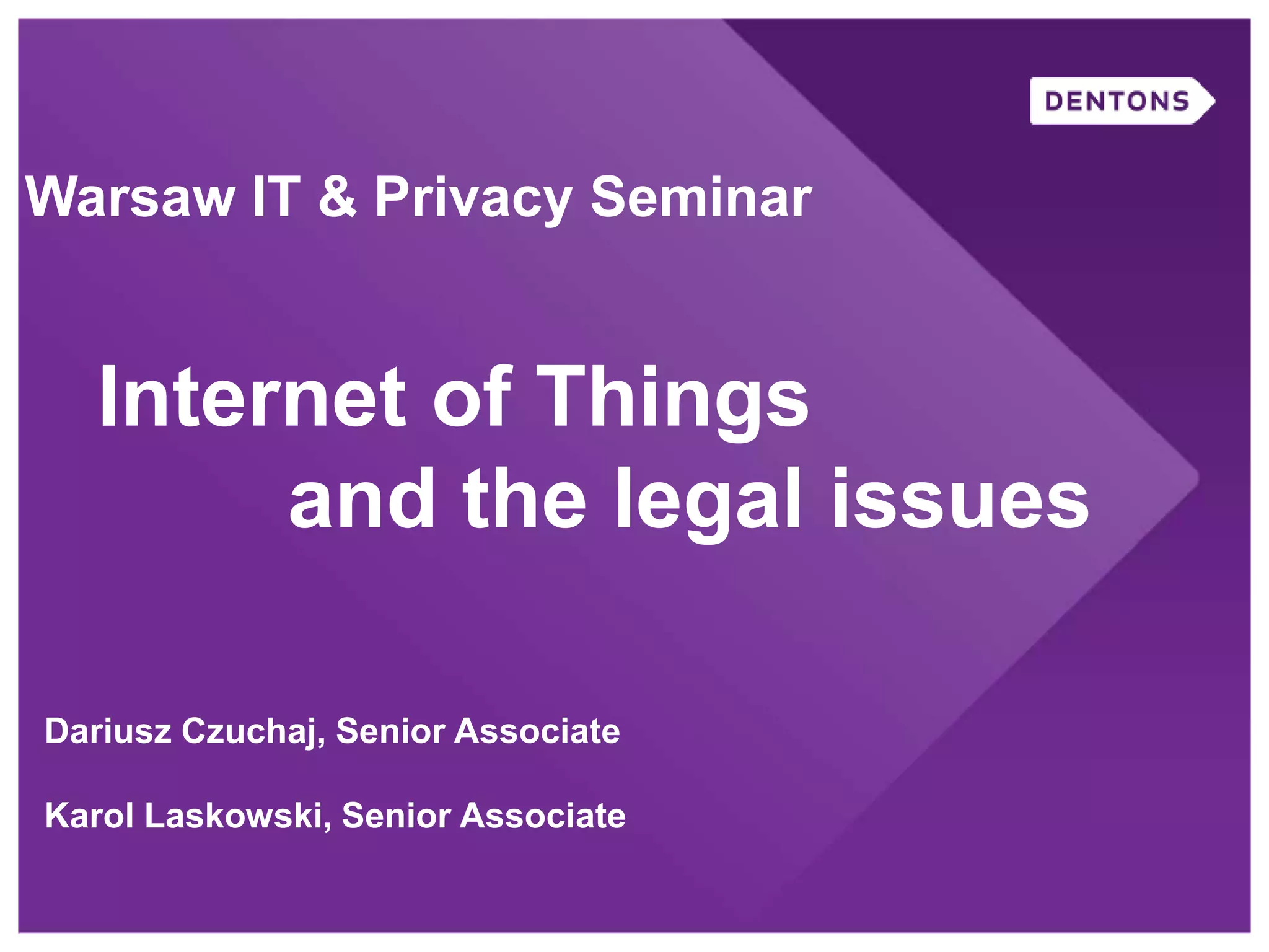 This document summarizes a seminar on legal issues related to the Internet of Things. It discusses definitions of IoT, categories of data collected, applicable laws around personal data protection, telecommunications, and cybersecurity. It also examines issues around determining data controllers, anonymizing personal data, critical infrastructure regulations, and ownership of IoT-collected business data.
