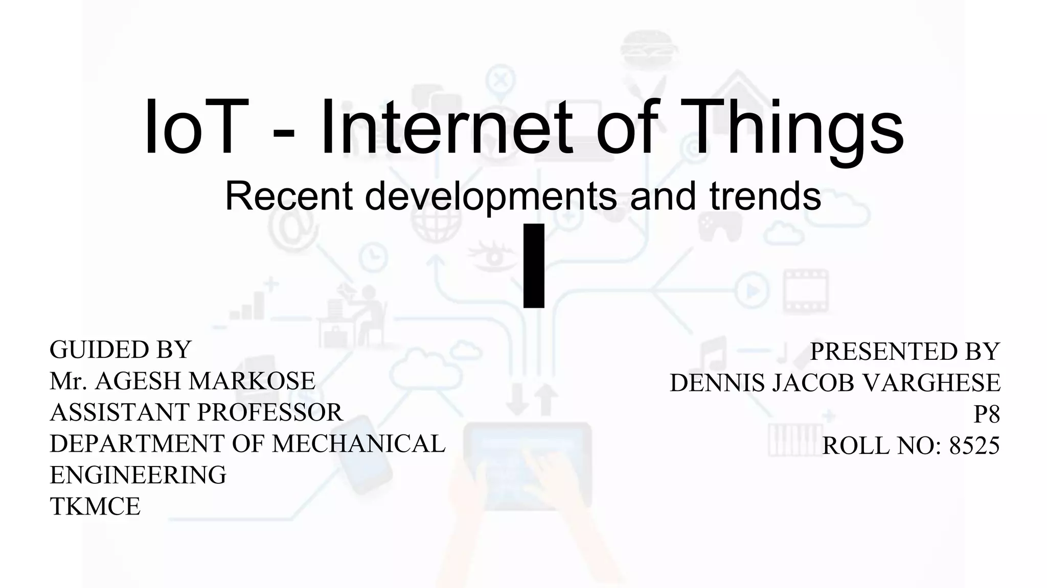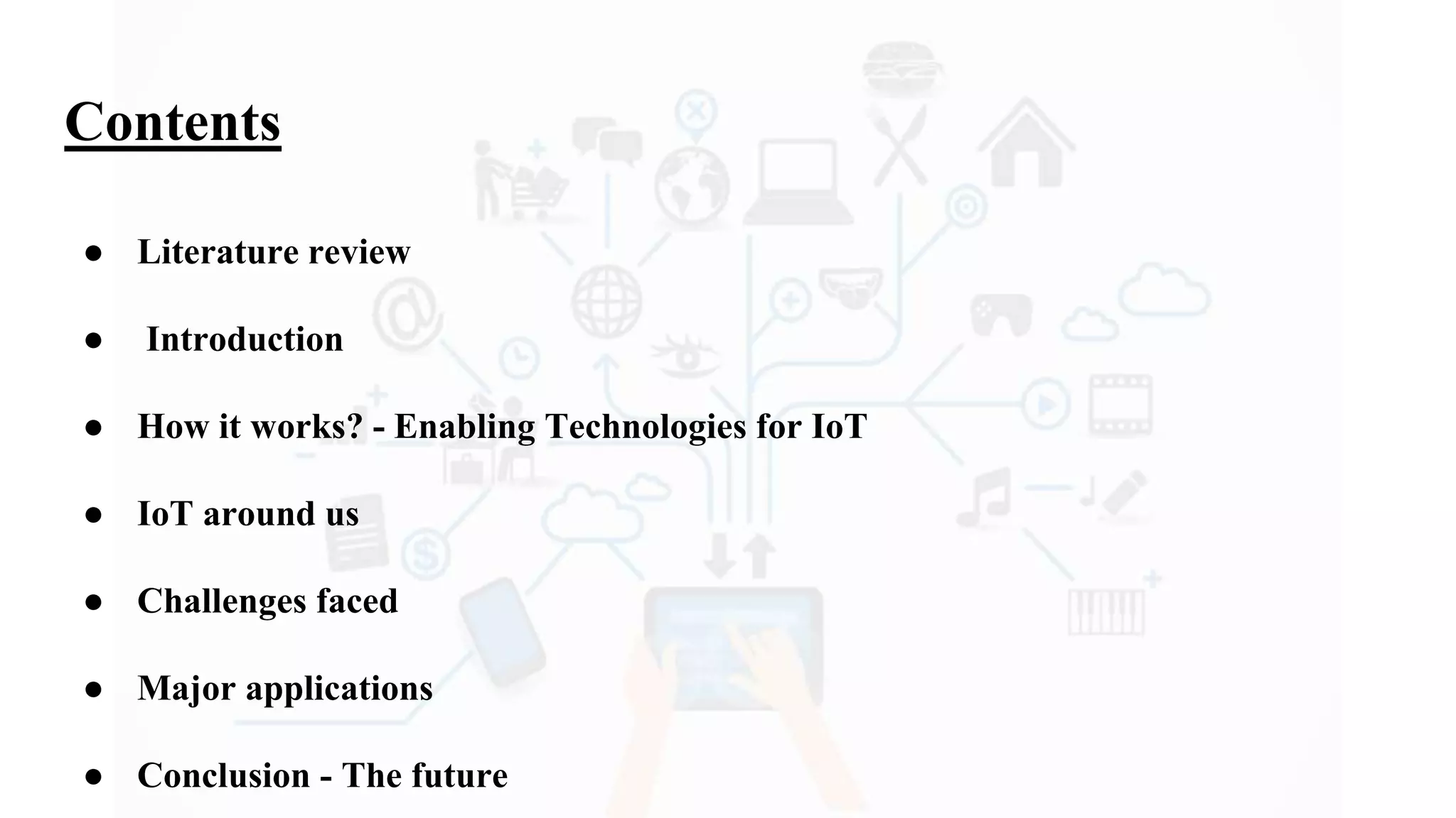 The document discusses Internet of Things (IoT), providing an introduction and overview. It defines IoT as the network of physical devices embedded with sensors and connectivity that allows them to exchange data via the internet. The document outlines some key enabling technologies for IoT like RFID, wireless sensor networks, middleware, and presentation tools. It also discusses some common challenges for IoT like security and privacy issues. Examples of major IoT applications are given in areas like smart cities, healthcare, home automation, and industrial control. In conclusion, the document states that IoT has the potential to enhance services across many sectors and will likely become widespread in the coming decade as the necessary technologies continue to develop.