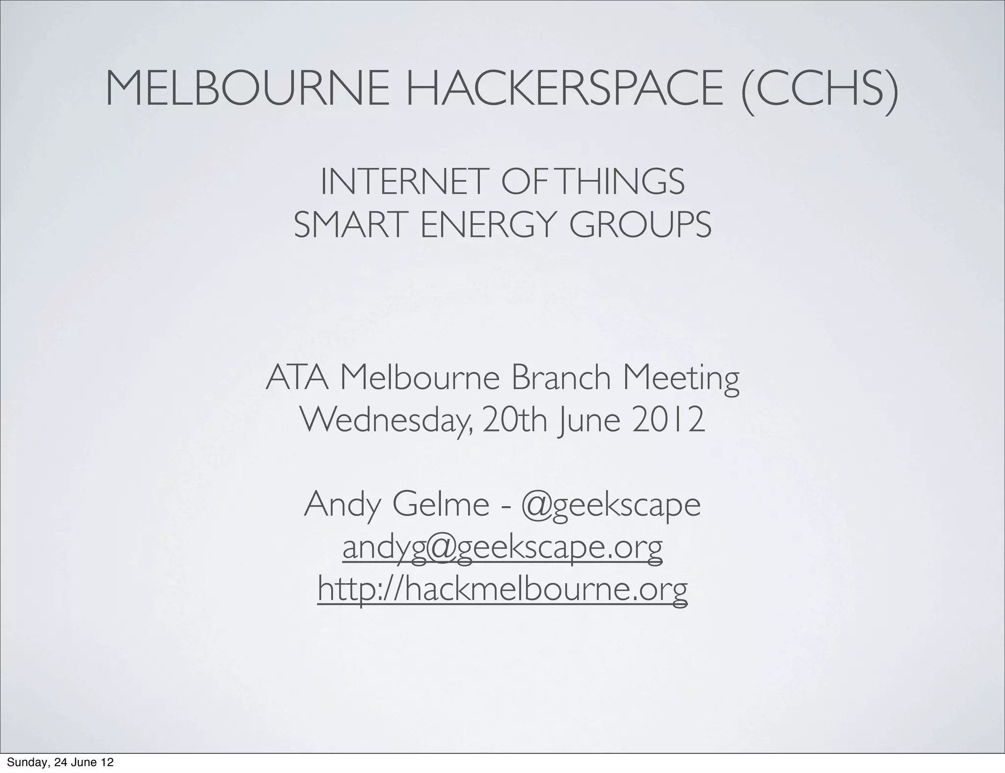 The document discusses the Internet of Things (IoT) and its impact on smart energy through low-powered, network-connected devices, particularly emphasizing the use of Arduino for development. It highlights the importance of measurement in energy management and introduces local smart energy solutions, including the SEGmeter and SEGshield, which utilize Arduino technology. The Melbourne Hackerspace offers workshops and collaboration opportunities for those interested in building their own smart meters.