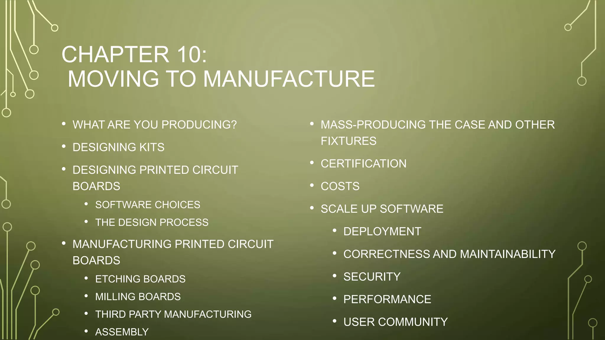 The document discusses the process of designing and manufacturing printed circuit boards (PCBs) for the Internet of Things (IoT) products, outlining various options for production including kits, ready-made boards, and fully-fledged products. It details the design process, PCB assembly, testing, and mass production techniques such as injection molding, as well as certification requirements for safety and compliance in different markets. The document also emphasizes the importance of software deployment, maintenance, and security in ensuring the proper functionality of the devices once they are in use.