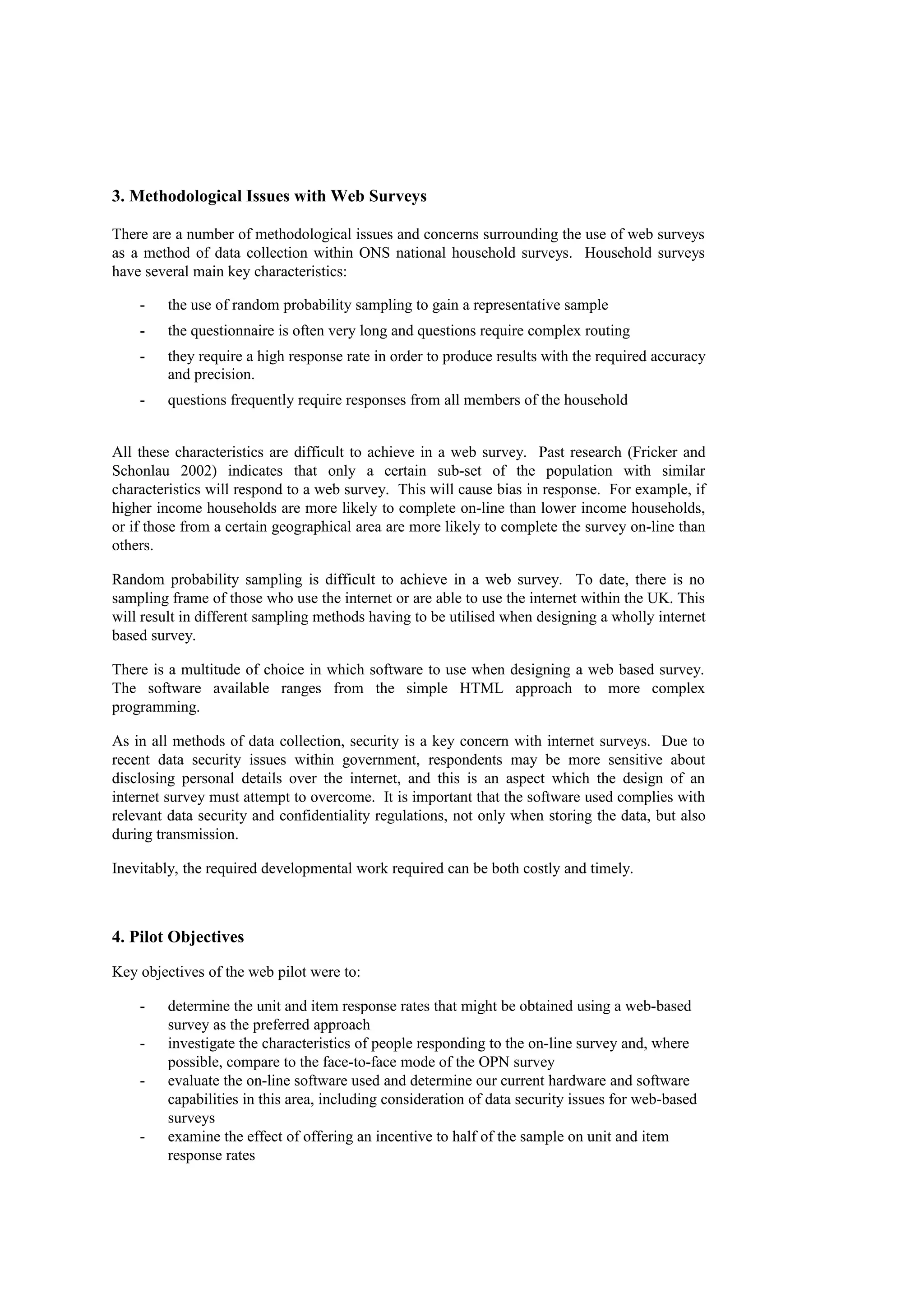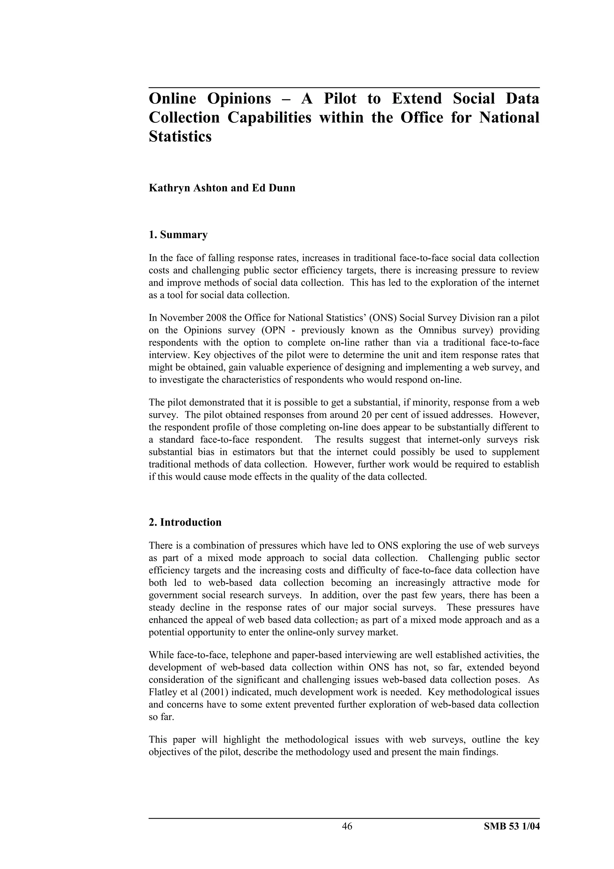 The document summarizes a pilot study conducted by the Office for National Statistics (ONS) to test using an online survey to supplement traditional face-to-face social data collection. The pilot obtained responses from around 20% of issued addresses but found the online respondent profile differed substantially from face-to-face respondents. While an online approach risks bias, it could potentially supplement traditional methods with further work. Key objectives were to determine response rates, understand online respondent characteristics, and evaluate online software capabilities and data security. The pilot provided valuable experience in designing and implementing a web survey within ONS.