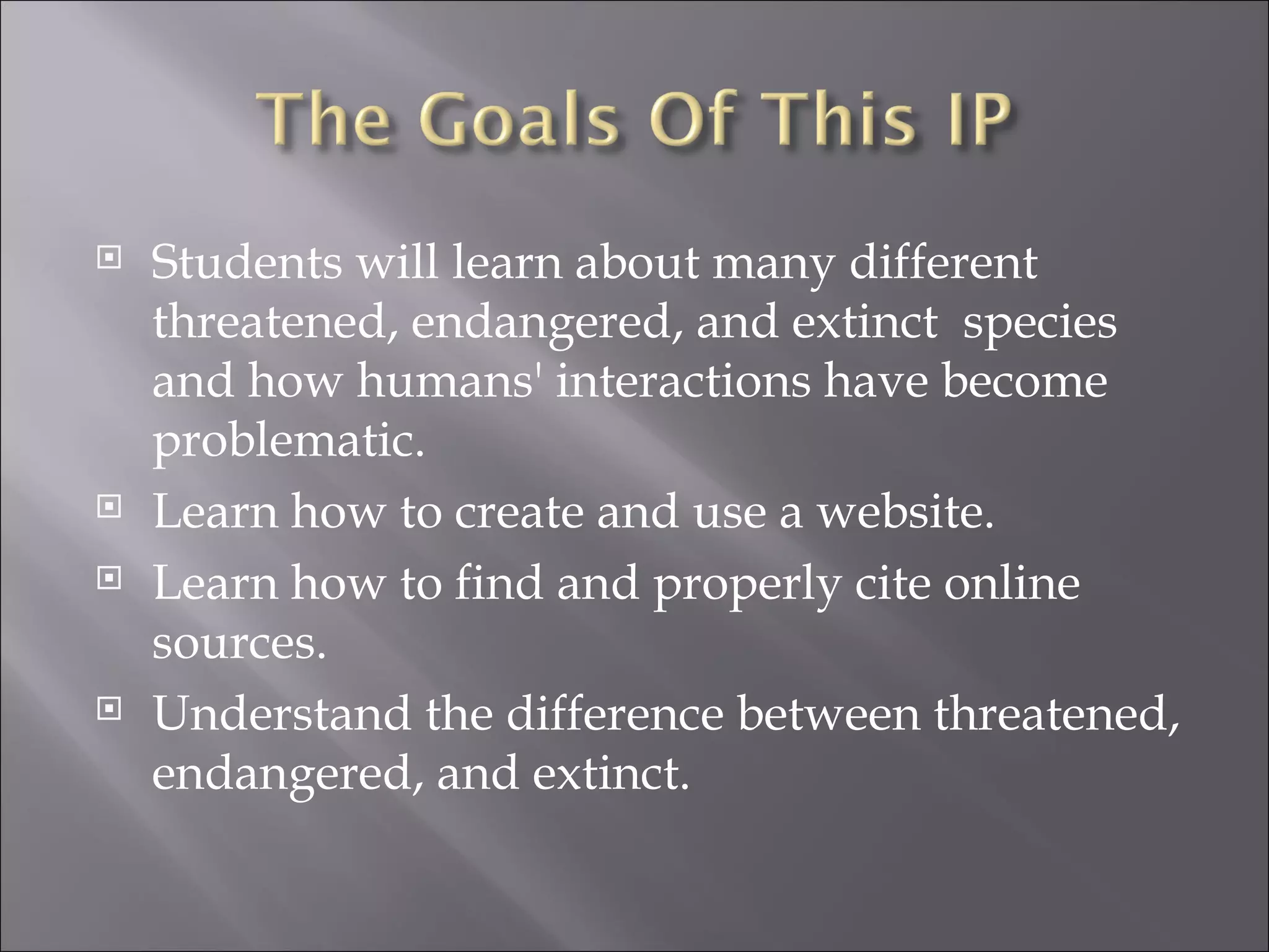 This document outlines a two-week student project on endangered species. Students will research a threatened, endangered, or extinct animal and create a website presenting information on the animal's habitat, threats, and conservation efforts. The project aligns with 8th grade science standards and will require research outside of class time. Students will present their websites and discuss their findings during class periods dedicated to the project.