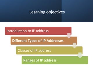 The document provides an overview of Internet Protocol (IP) addresses, detailing their role as unique identifiers for devices on a TCP/IP network. It explains the types of IP addresses (private and public), different classes of IP addresses (A, B, C, D, E), and how they function and are assigned by Internet Service Providers (ISP). Additionally, it outlines the ranges and characteristics of each IP class, emphasizing the importance of IP addresses in enabling communication within and between networks.