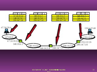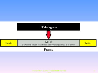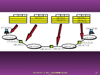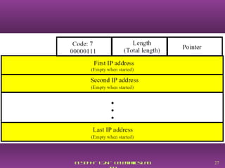 IP merupakan protokol yang mendefinisikan unit transfer data (datagram), proses routing, dan pengiriman paket secara tidak handal di Internet. Datagram IP berisi header yang mencakup versi, panjang header, tipe layanan, panjang total, identifikasi, flag, offset fragmen, waktu hidup, protokol, checksum, alamat sumber dan tujuan, serta opsi. Header digunakan untuk fragmentasi, penyusunan kembali, dan pelacakan rute datagram di jaringan.