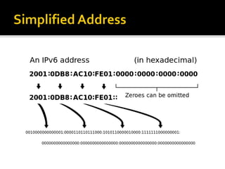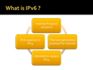 IPv6 was created to replace IPv4 as the next generation internet protocol due to IPv4 having a limited 32-bit address space that was running out, while IPv6 uses a 128-bit address space providing vastly more addresses. As an internet layer protocol, IPv6 and IPv4 are responsible for addressing, routing traffic across networks, and transferring data via packets. While IPv4 is still widely used, the transition to IPv6 is occurring gradually through awareness campaigns of the impending lack of IPv4 addresses.