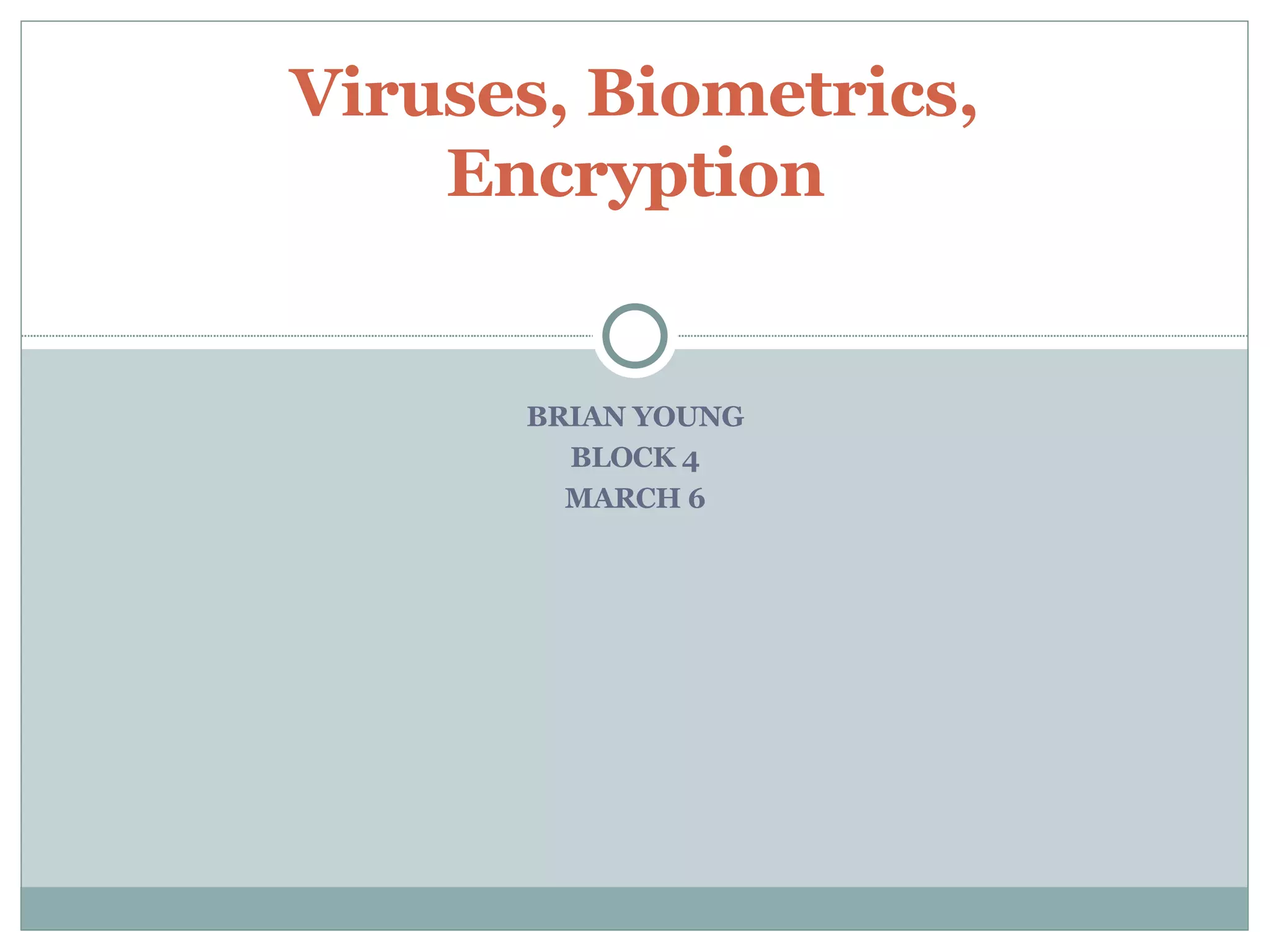 The document discusses various topics related to computer security including viruses like Code Red and Love Bug, biometrics for identification, phishing schemes, advantages and disadvantages of biometrics, how anti-virus software combats viruses, and types of information that should be encrypted like bank accounts, home address, and private family/friend details.