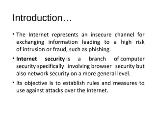 This document discusses various internet security threats such as hijacked web servers, denial-of-service attacks, cross-site scripting, email spoofing, and trap doors. It provides details on how these threats are carried out and potential defensive measures. The key threats are hijacking web servers to plant hostile code, denial-of-service attacks which try to interrupt services, cross-site scripting which injects scripts to steal cookies or phish users, email spoofing which forges sender addresses in spam/phishing, and trap doors which bypass authentication. Internet security aims to establish rules against such attacks over the insecure internet.