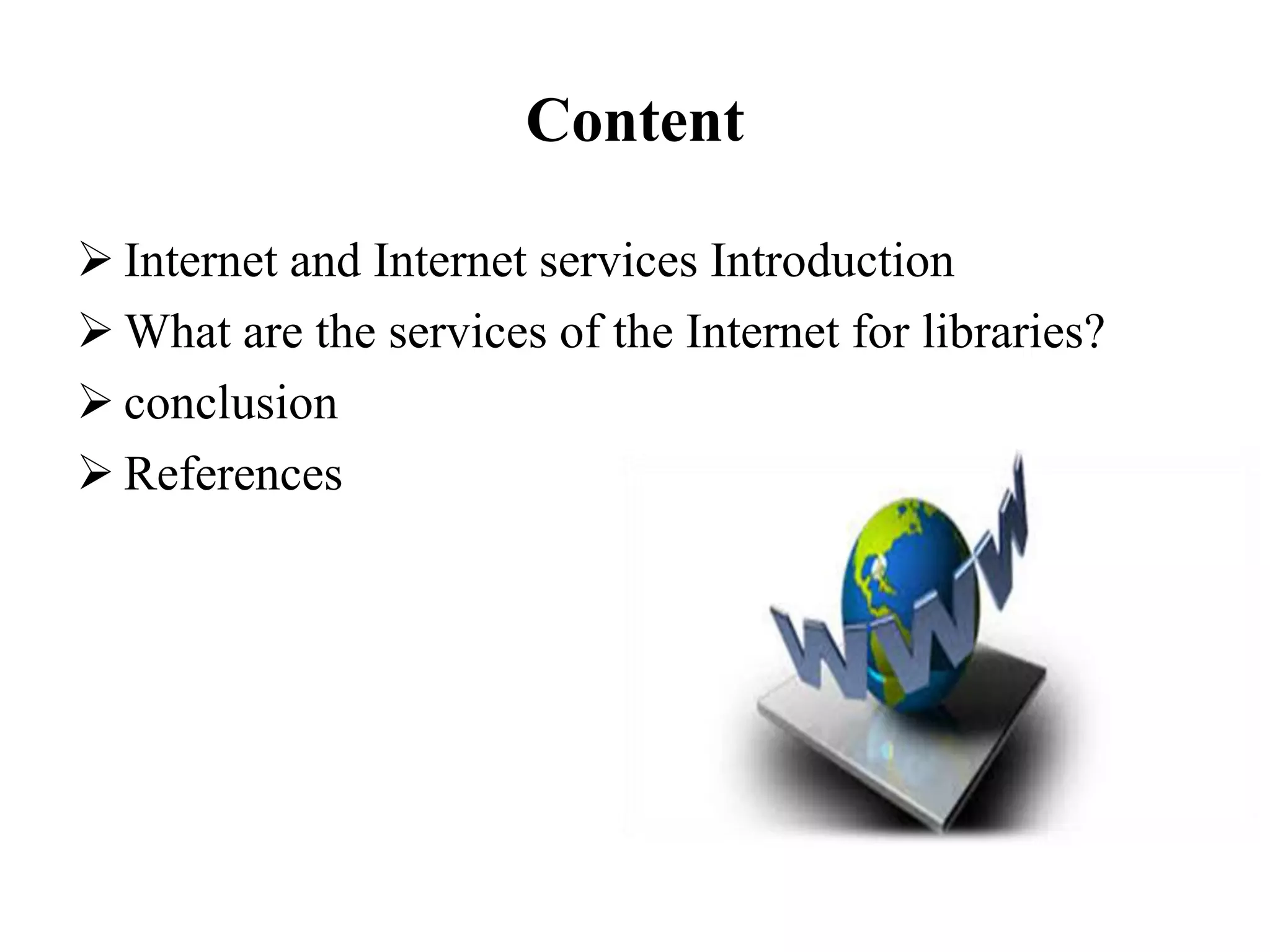 The document discusses various internet services that are useful for libraries. It describes key services like email, the World Wide Web, chat rooms, newsgroups, file transfer protocol, social networking sites, video conferencing, and how libraries can utilize them. Libraries can use the internet to acquire documents, conduct technical processing and cataloguing, improve circulation, provide reference services, share resources, and communicate with patrons, publishers, and vendors. The internet is a vital communication tool that allows libraries to enhance their services.