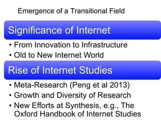 The presentation discusses the evolution and significance of internet studies as a transformative field, highlighting key questions about technology, usage, design, law, and policy. It notes the increasing number of internet users and the growth of centers for research and teaching in this area from 2000 to 2013. The document also references foundational texts and research mapping efforts that explore the landscape of internet research.