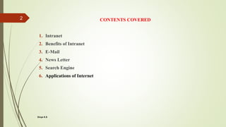 The document discusses various aspects of internet technology, covering intranets, e-mail, newsletters, search engines, and applications of the internet. It emphasizes the benefits of intranets for internal communication and collaboration while detailing the components and advantages of e-mail communication. Additionally, it highlights the extensive applications of the internet in areas like job searching, health information, travel, entertainment, shopping, and business.