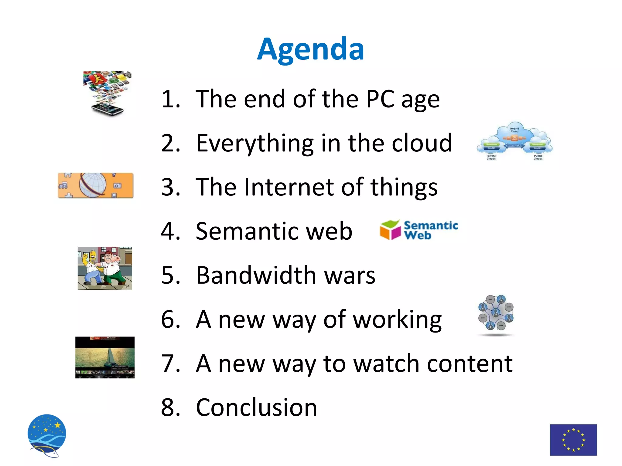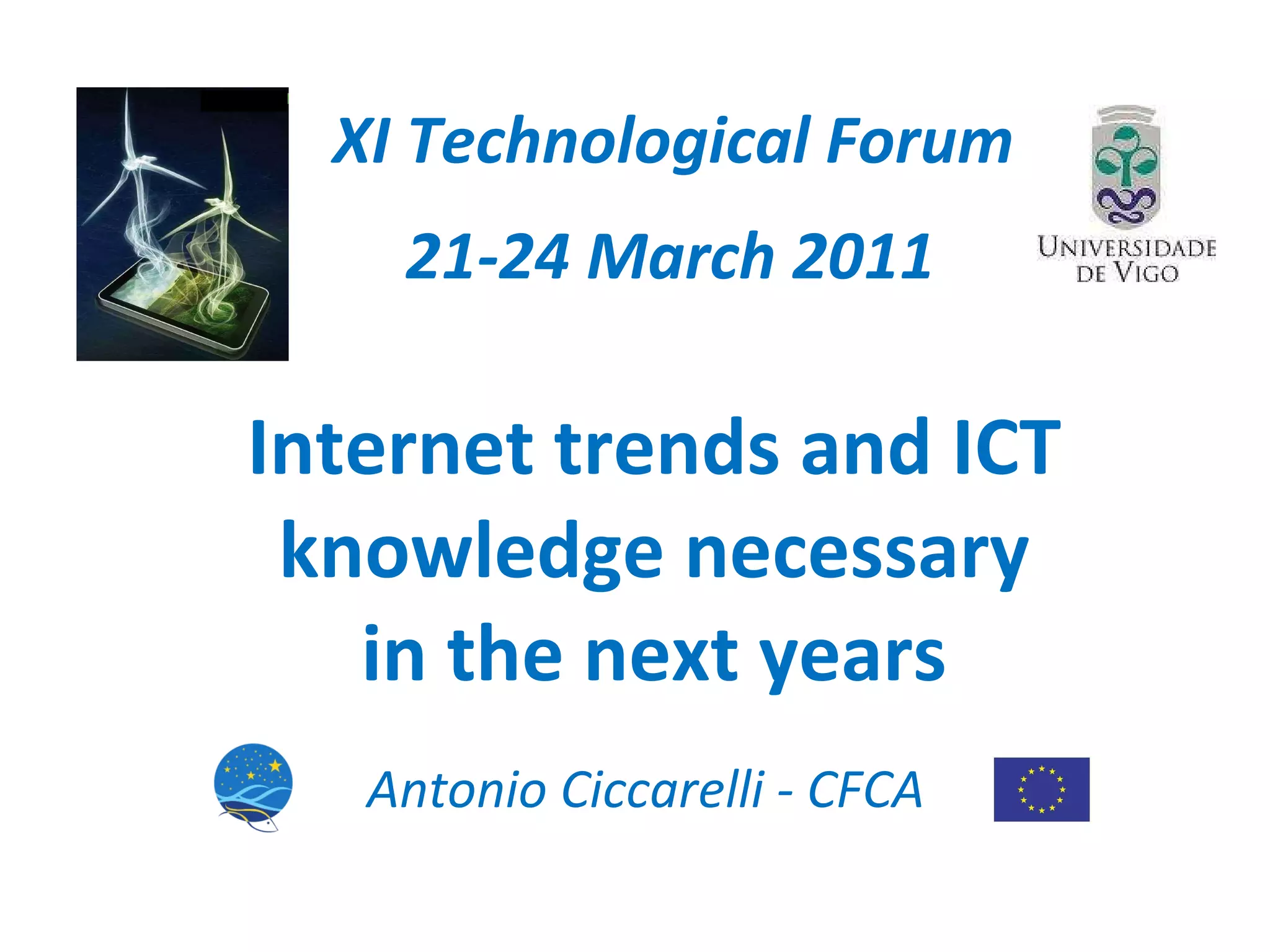 The document discusses key technological trends expected in the coming years, such as the decline of traditional PCs, the rise of cloud computing, and the growing significance of the Internet of Things. It highlights the challenges of semantic web technologies, intense bandwidth competition, and evolving content consumption models, particularly through personalized and on-demand platforms. Ultimately, it emphasizes the need for social and environmental responsibility within new ICT business models.