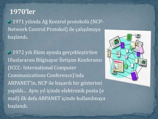 1970’ler1971 yılında AğKontrol protokolü (NCP-Network Control Protokol) ile çalışılmayabaşlandı.1972 yılı Ekim ayında gerçekleştirilenUluslararası Bilgisayar İletişim Konferansı(ICCC- International ComputerCommunications Conference)’ndaARPANET'in, NCP ile başarılı bir gösterimiyapıldı... Aynı yıl içinde elektronik posta (email) ilk defa ARPANET içinde kullanılmayabaşlandı.