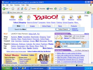 The document provides an overview of the history and components of the Internet. It discusses how the Internet started as ARPANET in the 1960s as a US military network. It grew to connect universities and later became commercialized. The document describes various Internet applications like email, telnet, FTP, and the World Wide Web. It explains how these applications allow communication and sharing of information over the global network of interconnected computers known as the Internet.