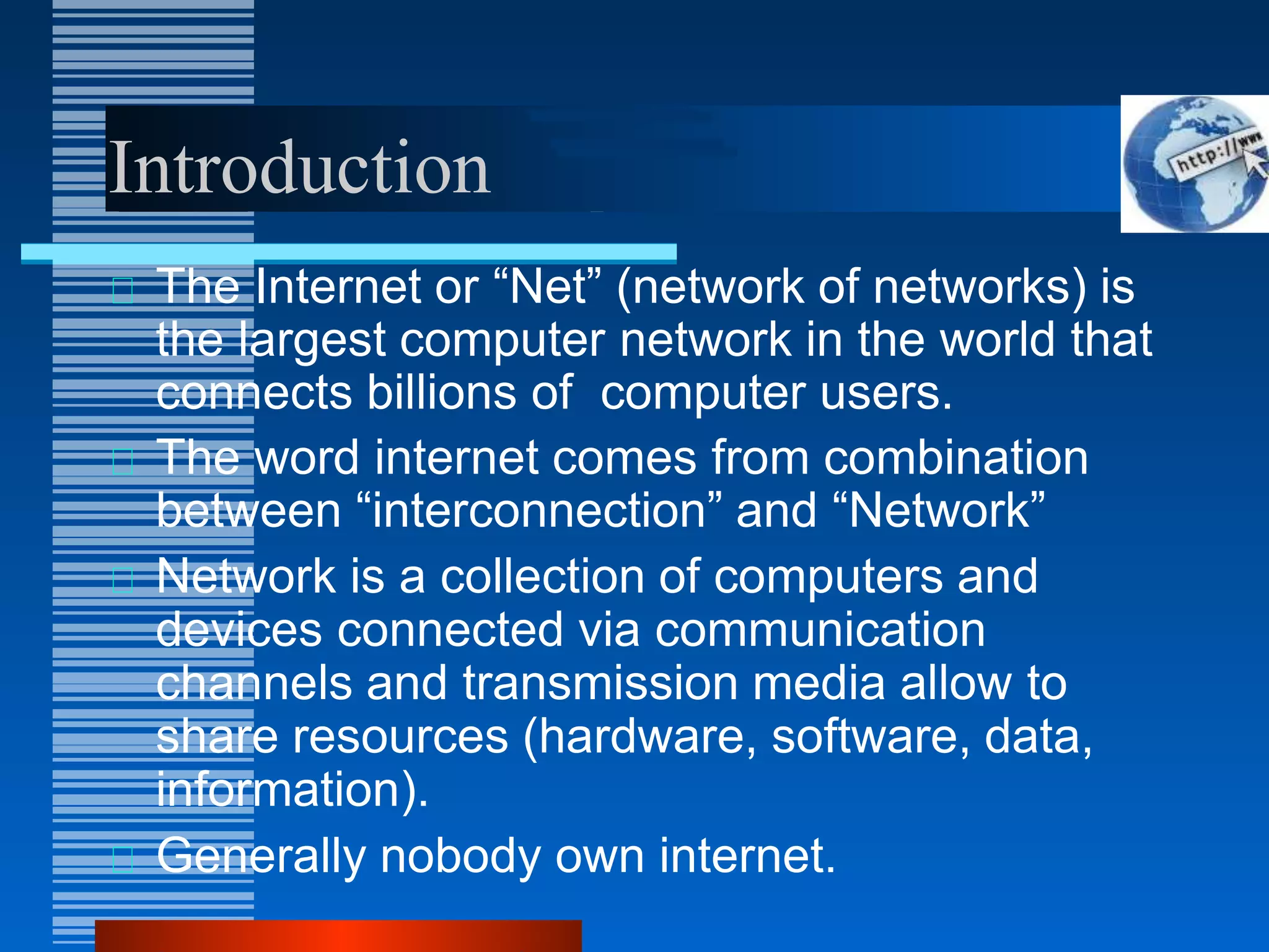 The document provides an introduction to the internet. It defines the internet as the largest computer network in the world that connects billions of users. It discusses the history of the internet from its beginnings in 1969 as an experimental network to its growth throughout the 1980s and 1990s when businesses and individuals started widely using it. The document also covers important aspects of how the internet works including protocols, browsers, email, and the world wide web. It discusses both advantages like improved communication, research, and education as well as disadvantages such as theft of personal information and malware threats.