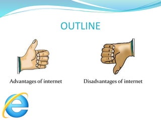 The presentation discusses the advantages and disadvantages of the internet. The advantages include its large store of information, ability to connect people, and various online services. The disadvantages are the potential inaccuracy of information, spread of computer viruses, existence of inappropriate websites, and risk of internet addiction. In conclusion, the presenter examines whether the benefits of the internet outweigh the potential harms.