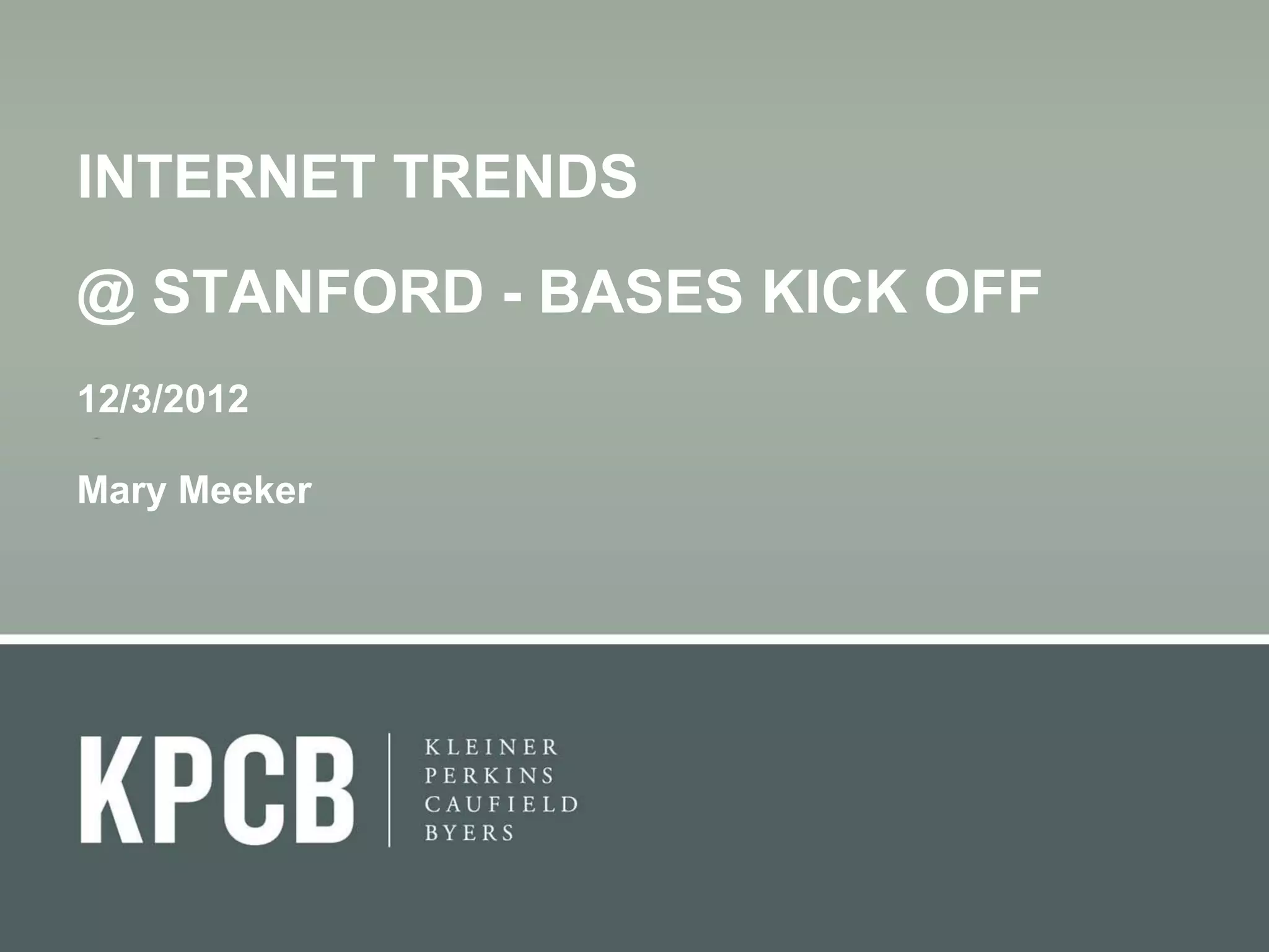 Mary Meeker presented an overview of internet trends at the 2012 Stanford Internet Trends conference. Some key points from the presentation include: