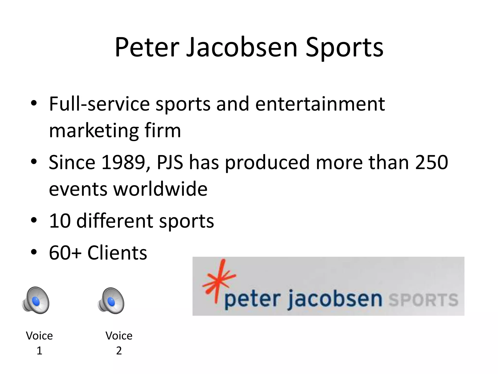 Peter Jacobsen Sports is a full-service sports and entertainment marketing firm that has produced over 250 events worldwide in various sports over the past 30 years. The company is independently owned and has over 25 employees across two offices in Portland, OR and Providence, RI. Jessica Hallet is interning as the Volunteer Coordinator, where she is responsible for recruiting and coordinating volunteers for the CVS Caremark Charity Classic golf tournament, which donates proceeds to various charities. Her goals are to gain professional experience and enhance her communication and problem-solving skills.