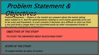 This document summarizes a study conducted on awareness of blockchain events. A questionnaire was distributed to attendees of a blockchain event to collect primary data. Key findings include: