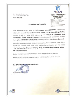 The document is an internship report submitted by Pranjal Singh Parihar, a 7th semester civil engineering student. It summarizes their 15-day internship spent observing construction of a multi-story residential building project called FCP Harmony in Nagpur, India. Over the course of the internship, the student learned about various aspects of construction including formwork setup, reinforcement, concrete mixing and placement, and curing. The report provides details on the companies overseeing construction, project specifications, tasks performed each day, and components and process of mivan formwork used for vertical surfaces.