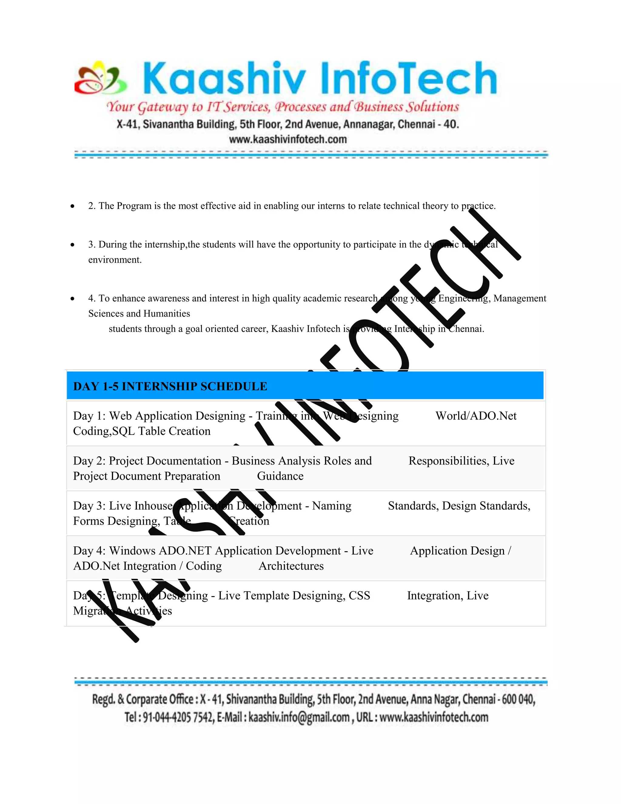 Kaashiv Infotech provides internship training for engineering students in fields such as computer science, electronics, and mechanical engineering. The 5-10 day training program provides hands-on experience in technologies like web development, databases, and software development. Interns will work on real projects, learn from experienced mentors, and gain skills and industry exposure to help decide their career paths. The training takes place in Chennai and interested students should contact the listed phone numbers or email addresses.