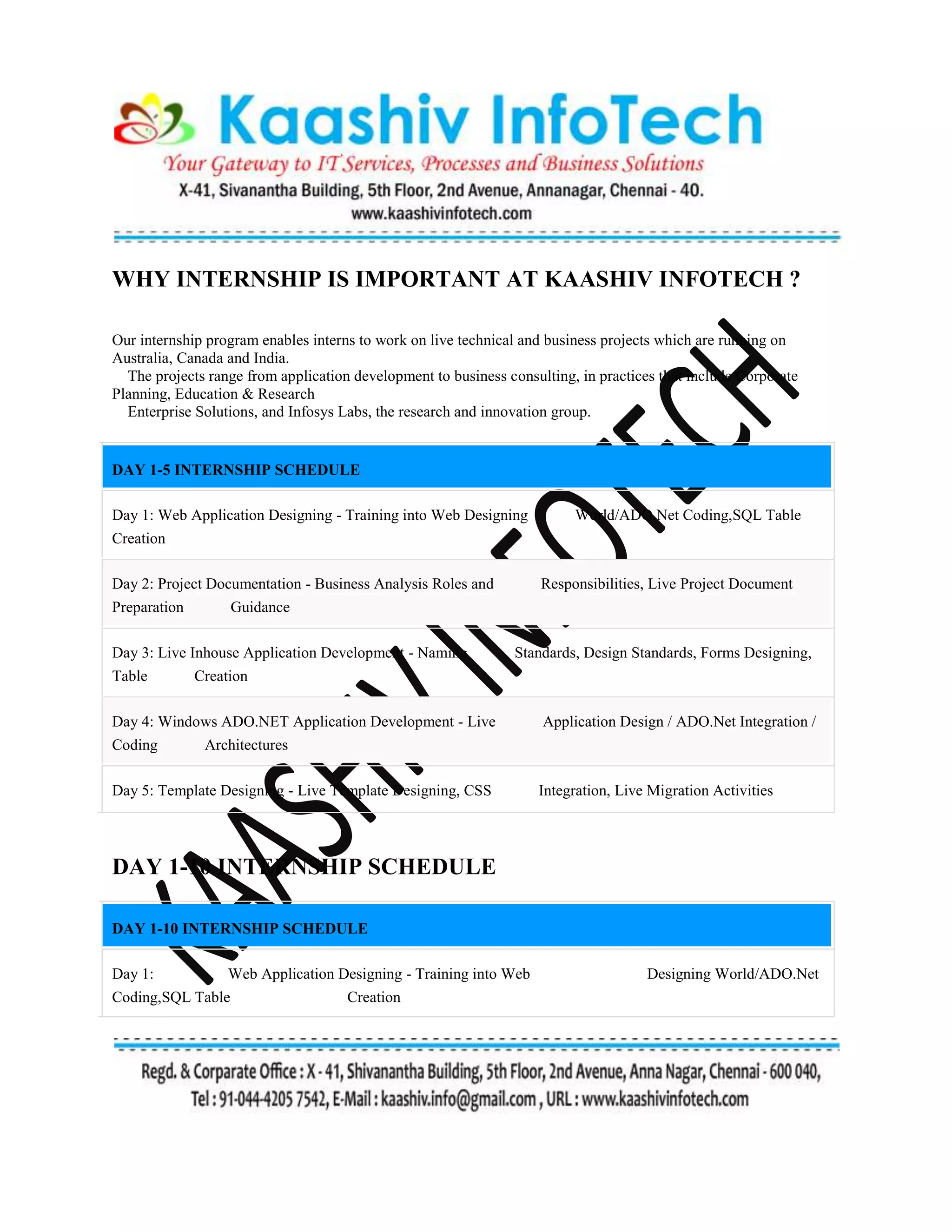 Kaashiv Infotech offers internship training for various technical and management students, enabling them to gain real-world experience through live projects. The program is designed to help interns identify their career interests, build professional networks, and enhance their employability in a competitive job market. Interns receive training in multiple technologies and benefit from guidance by experienced professionals.
