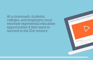 The document discusses the crucial importance of internships for college students in securing employment post-graduation, highlighting statistics that show a strong correlation between internship experience and job offers. It outlines challenges facing internship availability, including legal concerns over unpaid positions and changing student employment preferences, and promotes innovative practices among colleges to enhance internship programs. The narrative emphasizes the need for experiential learning opportunities that benefit students, colleges, and employers alike in a rapidly changing job market.