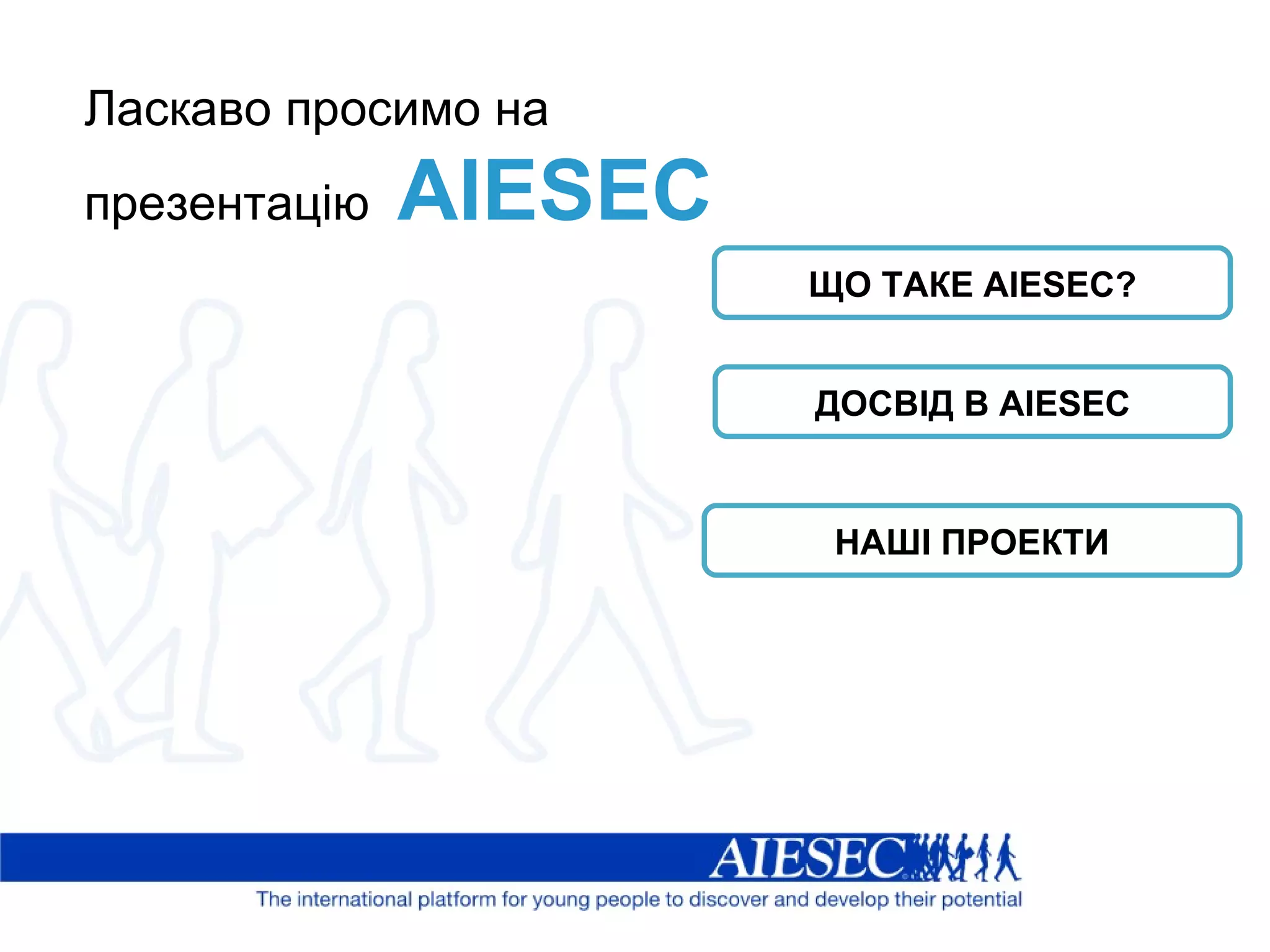 Ласкаво просимо напрезентацію AIESEC ЩО ТАКЕ AIESEC? ДОСВІД В AIESEC НАШІ ПРОЕКТИ